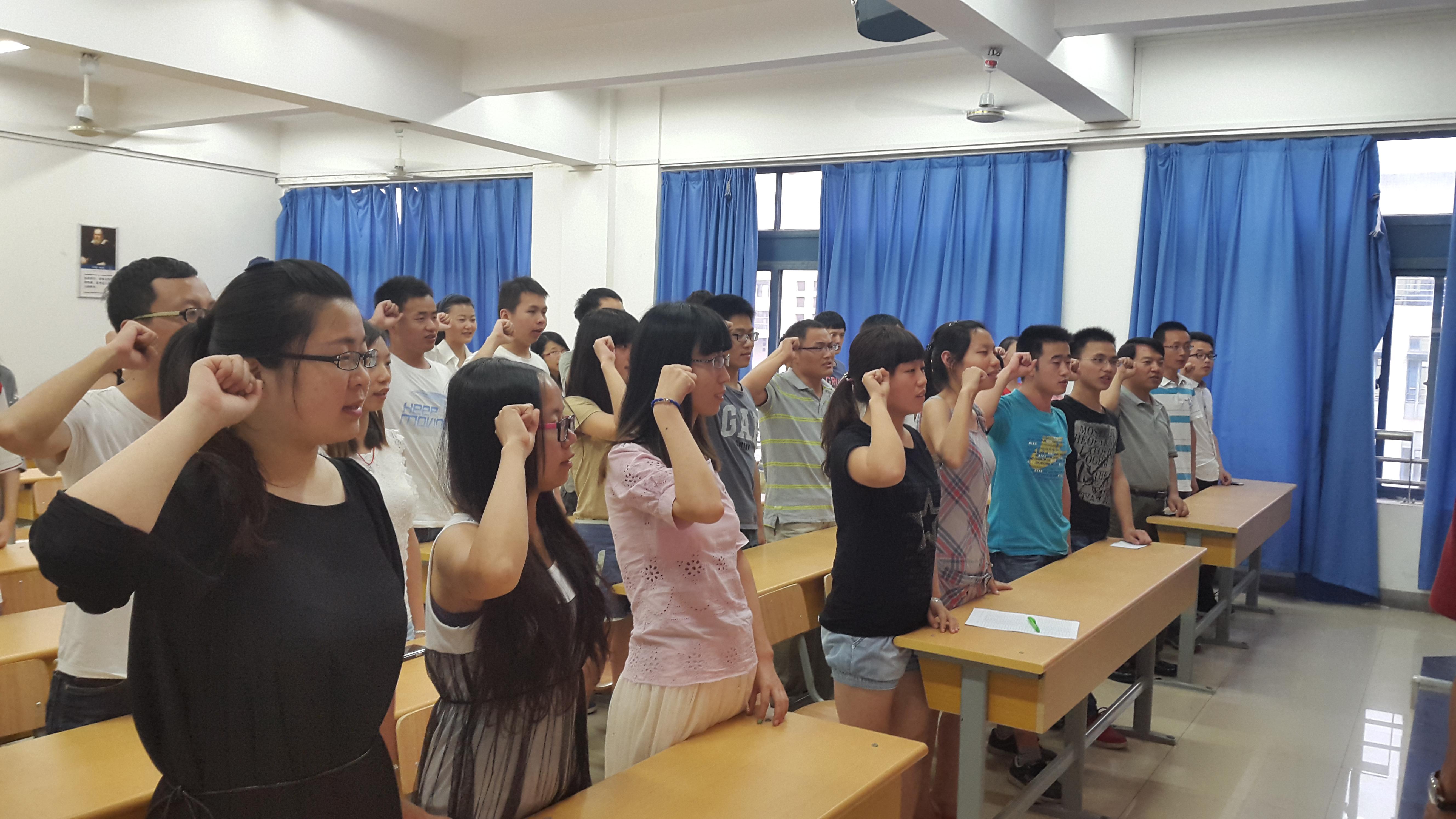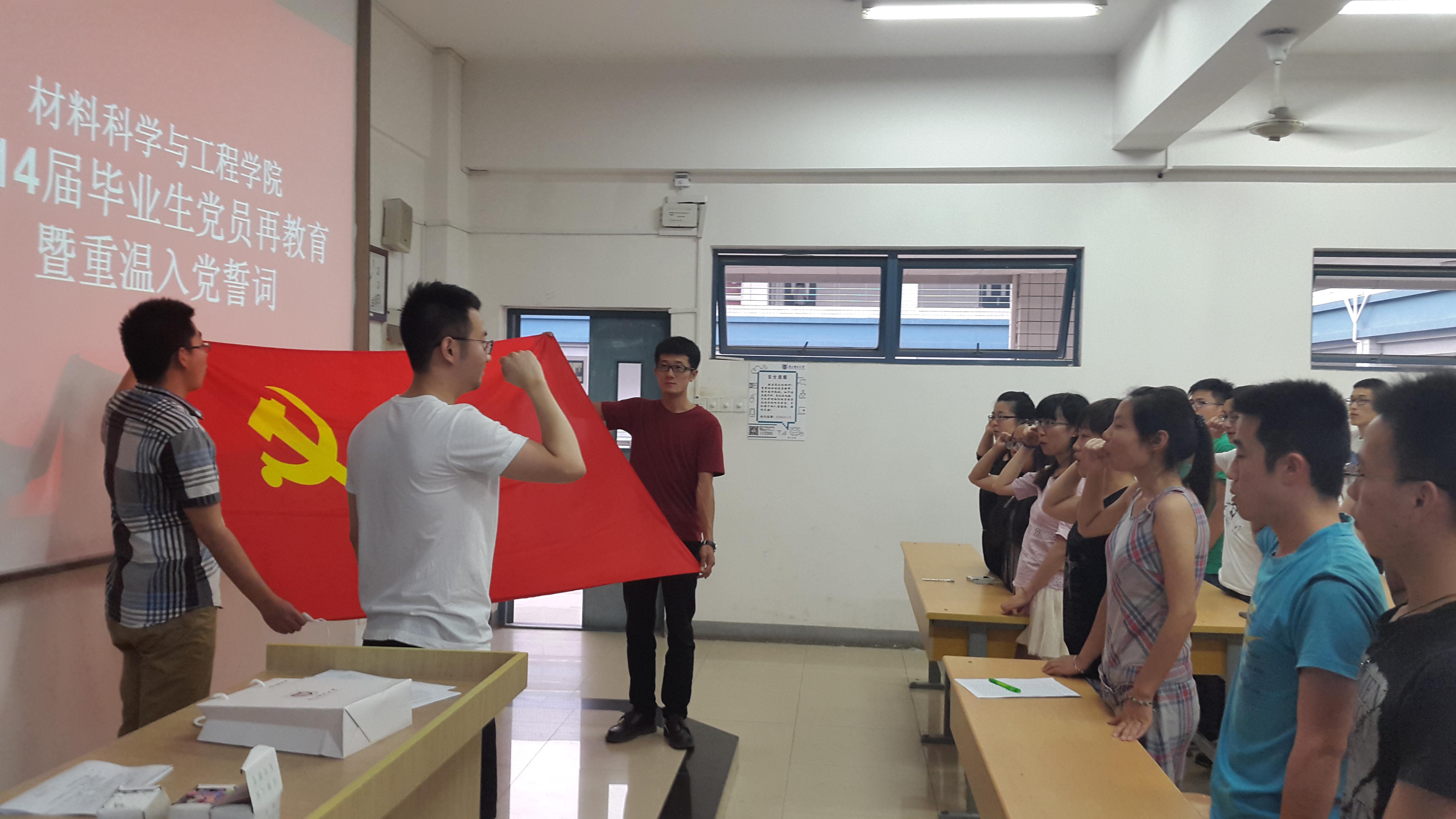 为了切实加强毕业生党员教育,提高毕业生党员的党性修养,激励毕业生党员在文明离校工作中充分发挥模范带头作用。6月10日,麻豆传媒 在教3-404教室举行了2014届毕业生党员再教育暨重温入党誓词主题活动。参加人员有院党委副书记于景宝老师,院组织干事、2010级辅导员刘颖老师及2010级本科生支部全体党员。