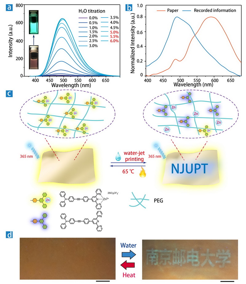近年来,再写纸由于具有环境友好、价格低廉、节约资源等优势引起了学术界与产业界越来越多的关注。然而,如何在再写纸上实现保存时间长的多色喷墨打印还是一个尚未突破的技术难题。因此,再写纸的实际应用一直颇受限制。该团队利用金属-配体动态配位这一原理发展了可彩色打印并能长久保存的再写纸制备技术。以不同的金属盐水溶液作为墨水,喷墨打印图案或文本时会与纸上的配体配位,从而使纸张改变颜色。由于可用的金属盐种类丰富,因此可以打印出丰富多彩的颜色。进一步,利用纯水可以调控配位键引起发光颜色的改变,从而实现绿色环保的无墨喷水打印。该项工作是黄维院士、赵强教授研究团队再次在Nature Communications上发表响应性光功能材料的相关工作。该工作第一作者为我校马云副教授与博士生佘鹏飞。