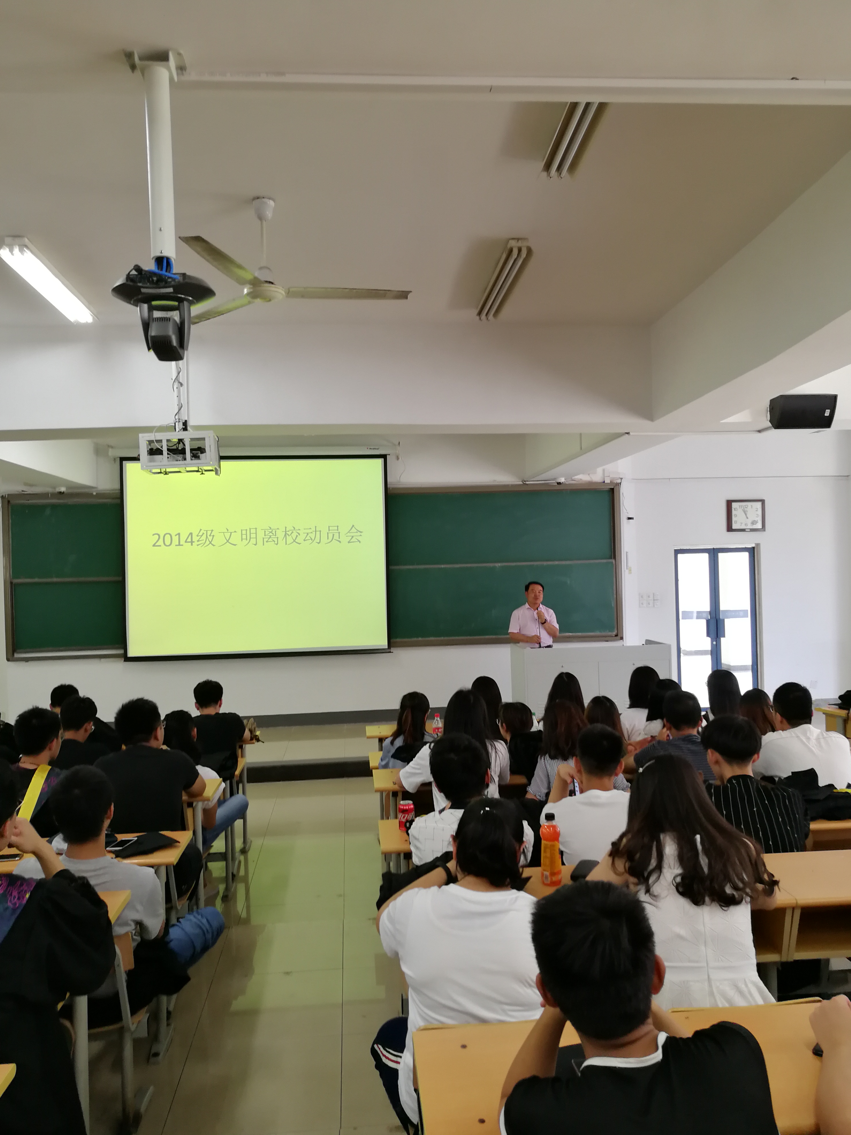 栀子飘香,桃李满园,为了做好今年毕业生文明离校工作,麻豆传媒 于2018年6月11日在教4-102召开2018届毕业生文明离校动员大会,参加人员有院党委副书记于景宝老师、2014级辅导员刘颖老师和全体2018届毕业生,会议由刘颖老师主持。