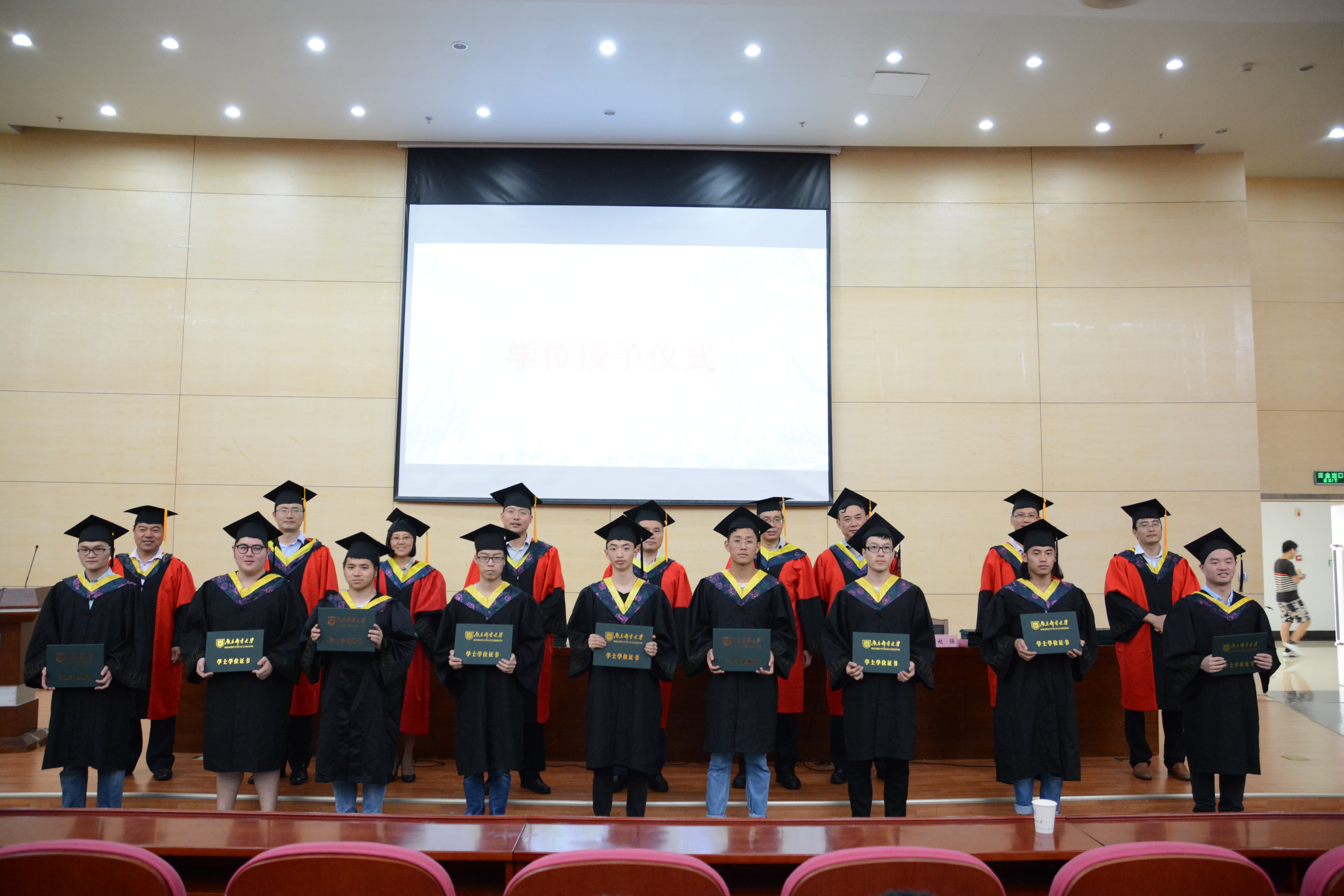 学院副院长陈润锋为大家宣读了《麻豆传媒 关于授予2018届普通本科毕业生学士学位的决定》。主席台导师为马翎等为189名毕业生正冠拨苏,颁发学位证书,并合影留念。