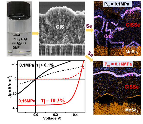 辛颢课题组以DMF为溶剂制备了可在室温下长期稳定存放的前驱体溶液,并由该溶液经旋涂、退火、硒化制备铜铟硒(CIS)吸光层材料和太阳能电池器件。他们发现,在常规(1大气压)条件下进行硒化反应得到的吸光层薄膜晶粒松散、膜层中存在纵向贯穿的空隙,导致化学浴沉积的CdS缓冲层渗透并贯穿了吸光层,造成器件短路,光电转换效率小于0.1%。通过增加硒化反应的气氛压力(1.6大气压),抑制了铟元素的丢失,得到贫铜的多晶薄膜,晶粒排布致密,CdS层在薄膜表面分布平整,电池光电转换效率提高到10.3%。而且,加压条件下制备的CIS膜不需要KCN、(NH4)2S等溶液的刻蚀来除掉表面杂相,简化了工艺,降低了对环境的影响。