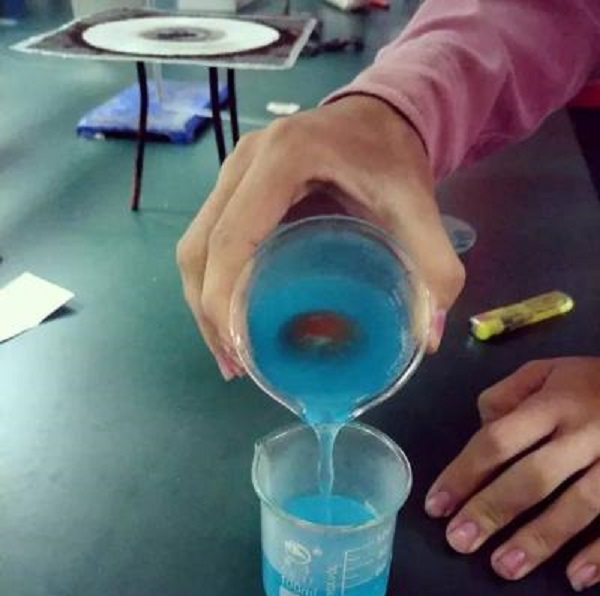 复赛是趣味化学竞赛中为值得期待的部分,以实验形式在化学实验室中开展,其中包含“蛋白留痕”、“硼砂白胶变果冻”、“自制指示剂”和“银镜反应”四种实验。“蛋白留痕”顾名思义就是在鸡蛋壳上留下字迹。“硼砂白胶变果冻”是将化学试剂混合后做成任意形状的胶状“果冻”。“自制指示剂”是通过使用植物色素和酒精制备指示酸碱的试剂。而“银镜反应”则是通过简单的有机置换产生光亮的银。本环节既考验了同学们的动手能力也考验了参赛学生的小组合作能力。实验开始前每组同学都对自己的实验进行了认真的分析,实验过程均按照实验步骤有条不紊的进行。最终大家的实验都取得成功,体验到化学实验的多姿多彩。