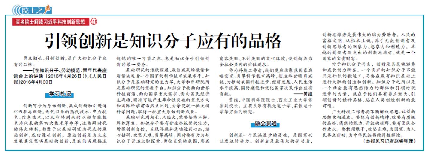 【中国科学报】黄维院士:引领创新是知识分子应有的品格