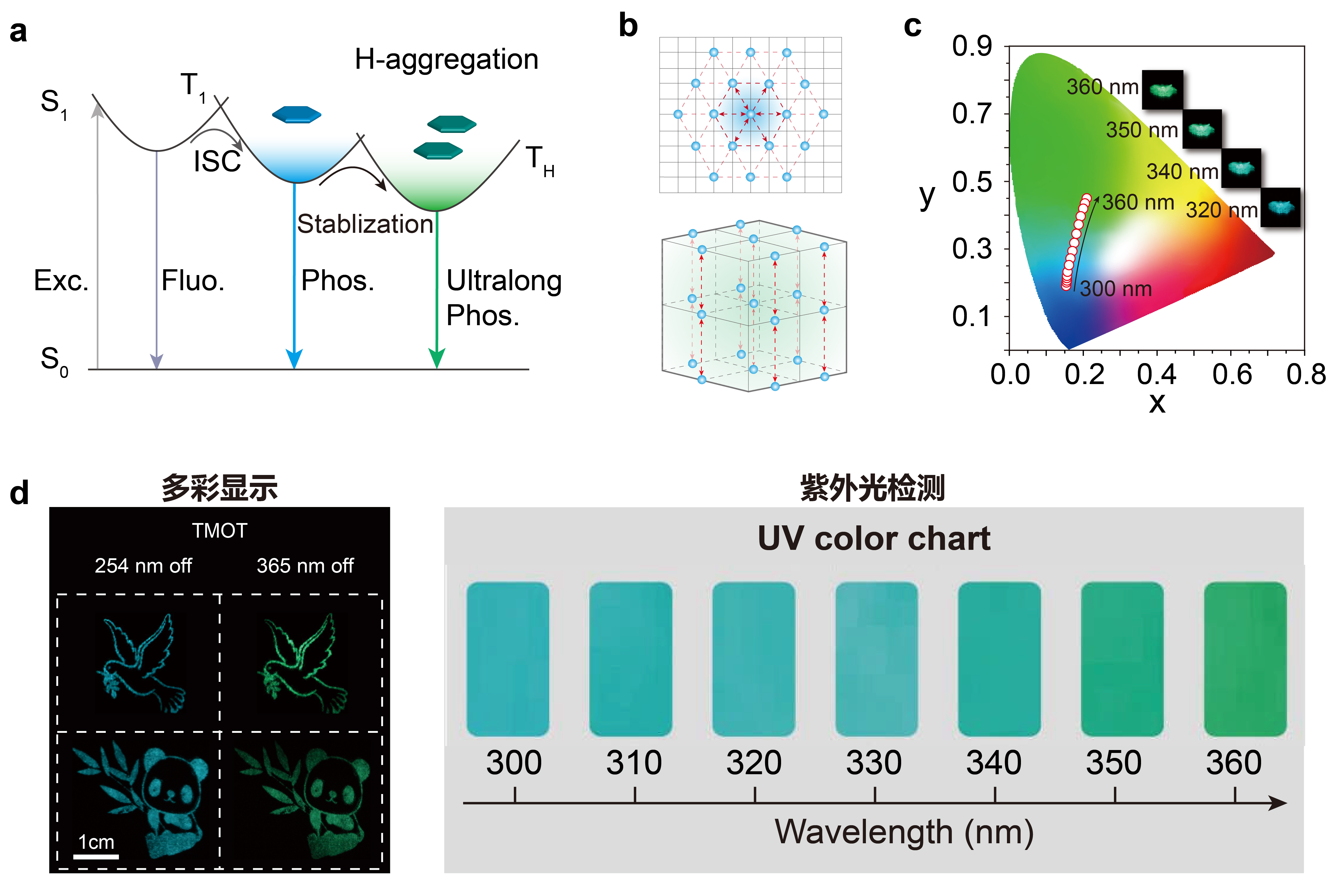 针对这一科学难题,我校黄维院士所带领的IAM团队与新加坡国立大学刘小钢教授课题组合作,借鉴量子点、碳点等纳米材料实现了多彩发光设计思想。在单一有机分子晶体中,通过巧妙的分子结构和晶体堆积设计,同时构筑分子态和聚集态的长余辉发光,获得了一系列激发波长依赖的动态多彩长余辉发光新材料。在晶体状态下,随着激发波长从250到400 nm的逐渐红移,有机长余辉发光颜色逐渐由紫色变为绿色,呈现出激发波长依赖的长余辉发光特性。该类材料的长余辉寿命为2.45秒,最大长余辉发光效率为31.2%。鉴于这种动态长余辉发光特性,该类材料被首次成功应用于多彩显示和可视化紫外光精准检测。该创新性研究成果不仅加深了我们对长余辉发光性质调控的认知,同时还为开发更加智能化的新材料并实现在有机光电子、柔性电子等领域应用提供了新思路。