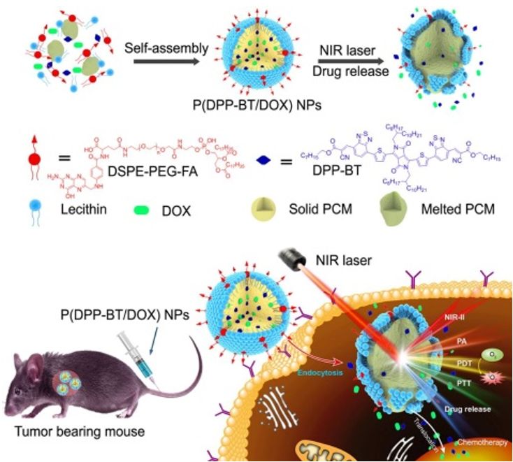 最近IAM团队范曲立教授、沈清明教授构筑了一种All-in-One的新型光学诊疗平台,实现了单一波长激光触发的NIR-II荧光/PA双模态成像指导的肿瘤PTT/PDT/化疗联合治疗。该课题组首先设计合成了新型有机小分子染料DPP-BT,该有机小分子染料不仅可以作为NIR-II荧光/PA双模态成像造影剂,同时还可以作为PTT/PDT联合治疗试剂;其次利用有机相转变材料实现有机小分子染料DPP-BT及化疗药物DOX的有效负载,从而得到具有热敏性质的All-in-One光学纳米诊疗粒子(P(DPP-BT/DOX) NPs)。在单一波长激光照射下,P(DPP-BT/DOX) NPs不仅具有优异的NIR-II荧光及PA成像能力,而且具有良好的PTTPDT效果。同时,有机小分子染料DPP-BT在激光照射下产生的高热可以使得P(DPP-BT/DOX) NPs发生相变,进一步导致DPP-BTDOX的释放,从而实现化疗效果(Scheme1)。该智能响应性多功能诊疗体系的设计、开发为癌症精准诊疗领域研究提供了有效的方案。