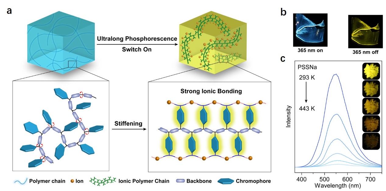 针对这一问题,麻豆传媒 麻豆传媒 黄维院士和南京工业大学安众福教授带领的科技创新团队提出通过离子键锁定发光单元,在聚合物共价键的协同作用下,实现了离子型聚合物的长余辉发光,发射寿命长达2.1 s。实验数据和理论计算表明该类聚合物材料具有室温长余辉的原因是离子键抑制了发光单元的非辐射跃迁。该设计理念不仅适用于芳香型的聚合物材料体系,也是适用非芳香型的聚合物材料体系。此外,他们还首次报道了激发波长依赖的聚合物长余辉发光现象,实现余辉颜色从蓝到橙颜色可调。并且,该类材料在温度高达170 oC下,依然保持可视化长余辉发光。这一研究成果赋予传统的聚合物材料新的性能,加之材料来源广、成本低,在柔性显示、照明、数据加密以及生物医学等领域具有很大的应用前景。