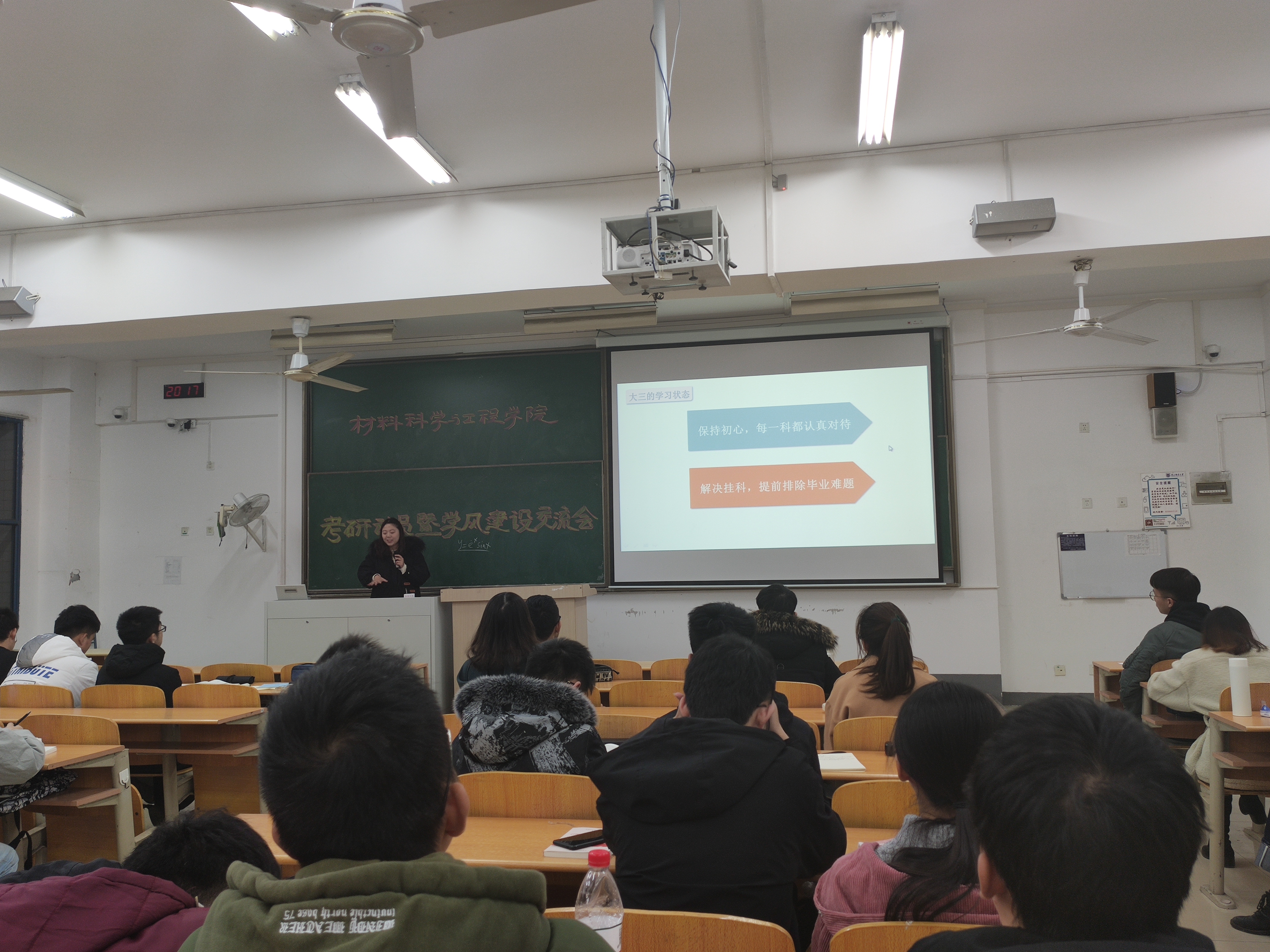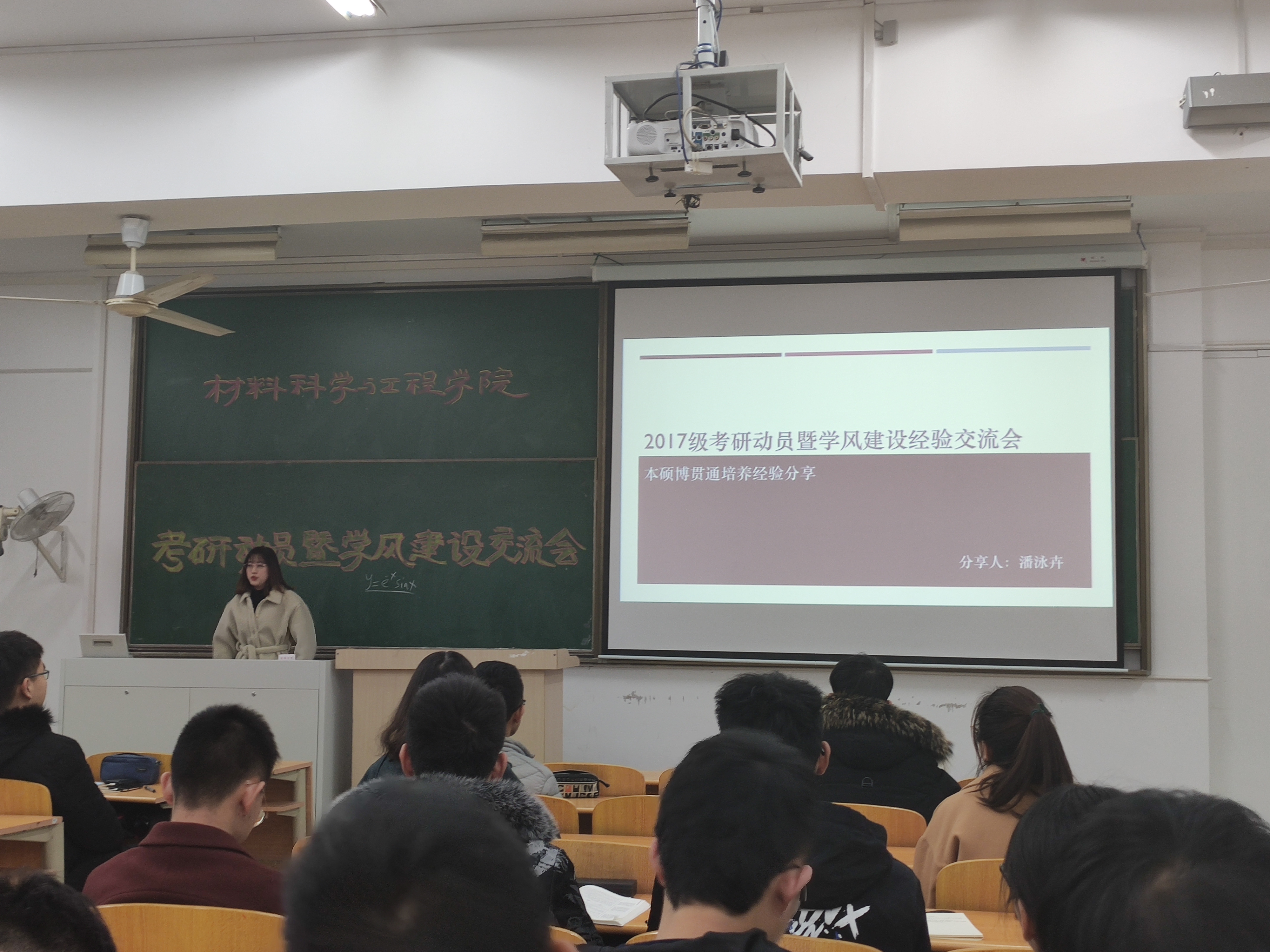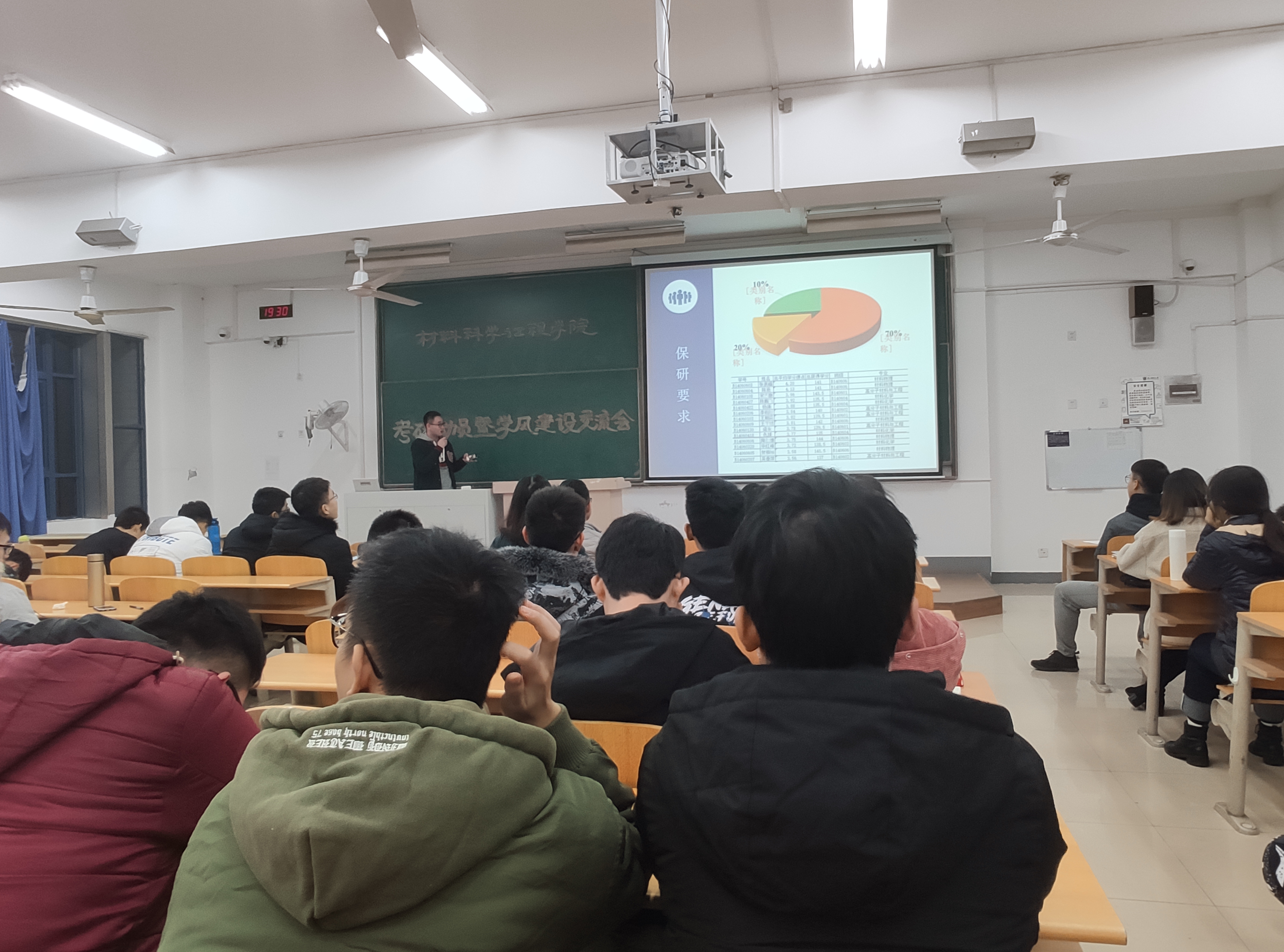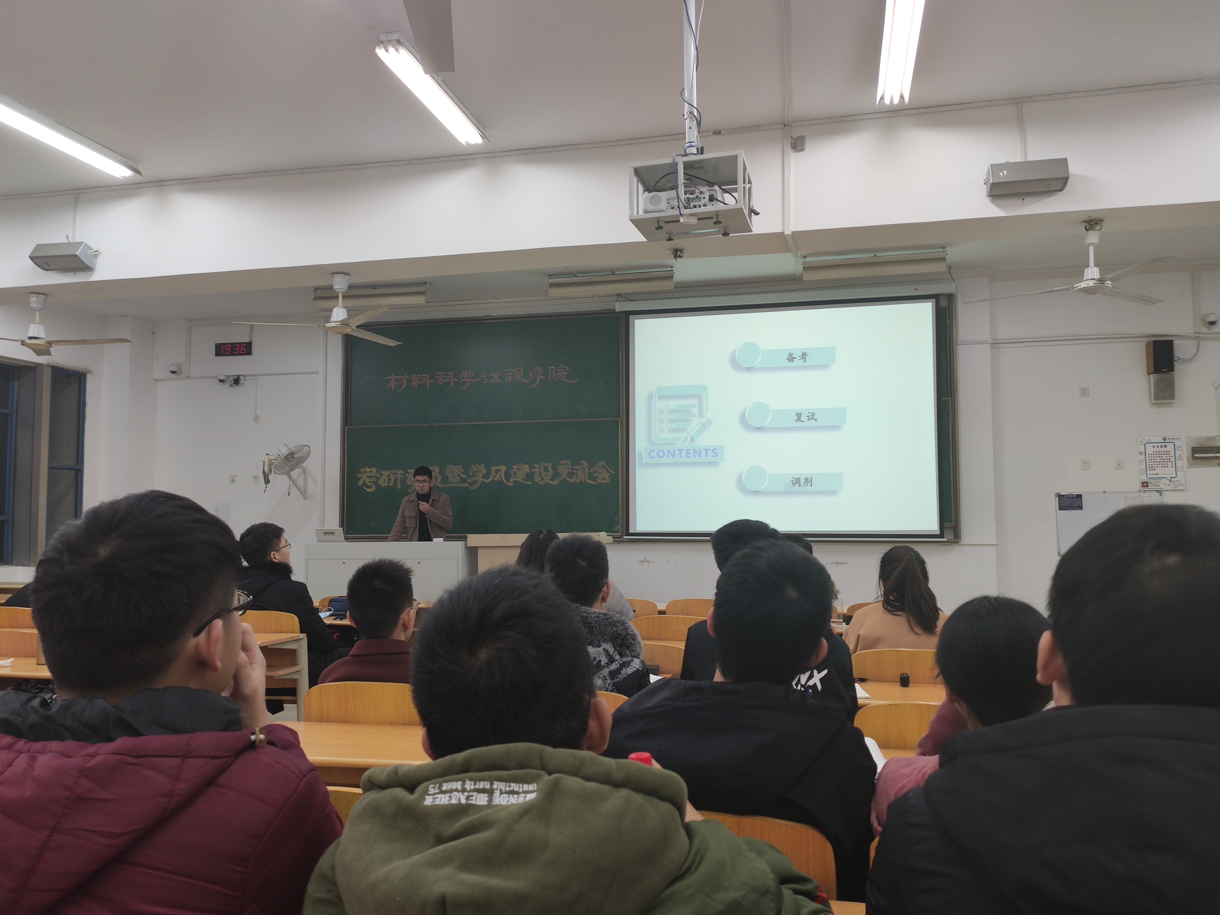 接着,2018级研究生仇球同学向大家分享了他在材料院保研的经历及收获,并且向大家详细地介绍了整个保研流程及要求,并鼓励大家可以走保研这条“捷径”;2019级研究生吕文轩同学向大家分享自己考研之前和之后的心理变化,分别就如何合理规划、如何协调大学生活提出了中肯的建议,强调有付出才会有回报,珍惜大学四年的美好时光;2019级研究生黄飞同学从考研目的、择校及专业、备考建议三方面讲述了自己考研时的收获,并强调学习始终是需要摆在第一位的,希望大家树立专业理想,拒绝懒惰,多想多做才能终有所得;2016级本科生韩丽同学介绍了如何备战考研并鼓励大家既然选择考研就不要轻言放弃,要坚定信心持之以恒,有志者事竟成;2016级本科生潘泳卉同学分享自己是如何选择学院的本硕博贯通培养计划的,并希望大家能脚踏实地,认真考虑自己的将来,早做打算。