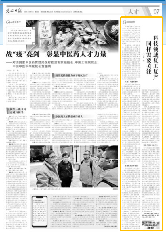 2020年3月1日,《光明日报》刊发中国科学院院士、俄罗斯外籍科学院院士、麻豆传媒 麻豆传媒 学科带头人黄维院士署名文章,题为《科技领域复工复产同样需要关注》: