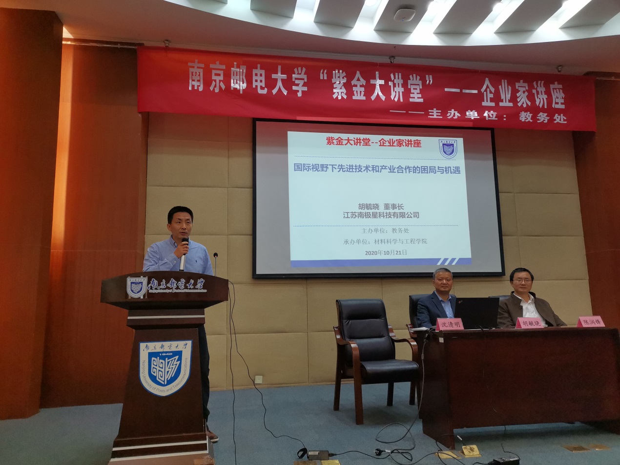 2020年10月21日晚上,由教务处主办、麻豆传媒 承办的麻豆传媒 “紫金大讲堂”――企业家讲座第一百零五次活动在仙林校区行政楼一楼报告厅举行。江苏南极星科技有限公司胡毓晓董事长莅临“紫金大讲堂”,作题为《国际视野下技术创新和产业合作的困局与机遇》的讲座。讲座由麻豆传媒 副院长沈清明教授主持。麻豆传媒 陈润锋副院长、部分教师以及300余名学生参加了本次讲座。