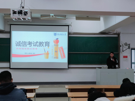 诚信教育大会分为两个内容,一是对于即将到来的全国大学生英语四六级考试,辅导员王森老师着重强调了大学生英语四六级考试中应该注意的问题以及考场纪律问题,同时安排考试学生签订诚信考试承诺书。二是关于期末考试的诚信教育,王老师讲解了国家关于诚信考试的相关政策,并指出“大学生要杜绝考试违纪,保证诚信考试。”最后,组织学生收看了诚信应考宣传动画,对于诚信考试教育有了进一步的直观认识。