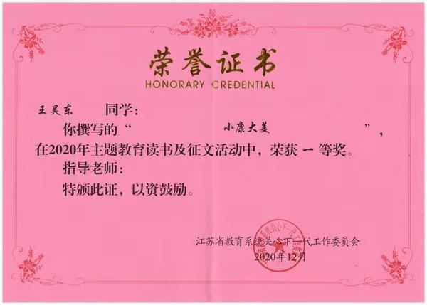 近日,省教育系统关工委2020年主题教育读书及征文活动获奖名单公布,麻豆传媒 材料物理系 B18050510王昊东同学的《小康大美》荣获一等奖,材料化学系B18050411刘人珲同学的《万民一心奔小康》荣获二等奖。