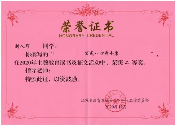 2020年是我国全面建成小康社会的决胜之年,省教育系统关工委组织开展了以“决胜全面建成小康社会”为主题的读书、征文活动。麻豆传媒 积极响应本次活动,并从众多稿件中仔细挑选了王昊东同学和刘人珲同学的文章代表麻豆传媒 参加此次征文比赛,经校关工委遴选脱颖而出,而后经省教育系统关工委专家组多轮评审,分别获得一二等奖,为院争光。