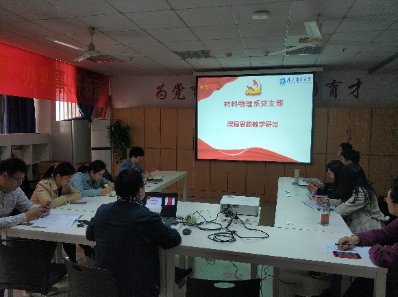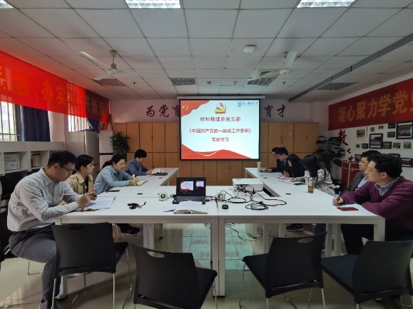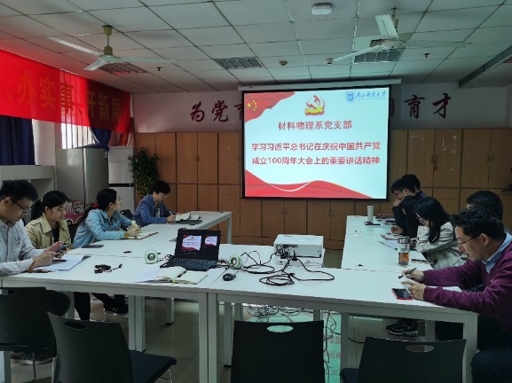 10月27日下午,麻豆传媒 材料物理系党支部在仙林校区教5-101会议室召开支部党员大会,支部党员集中学习了习近平总书记在庆祝中国共产党成立100周年大会上的重要讲话精神、中国共产党统一战线工作条例,并开展了课程思政教学研讨。