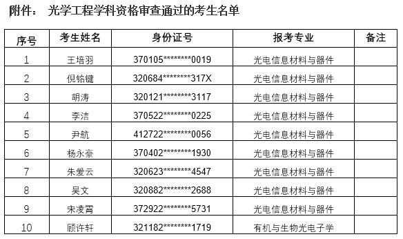 根据学校相关规定,光学工程学科申请考核博士生选拔领导小组根据考生所提交的申请材料,对其报考资格、基本素质和科研潜质进行了评估与初选,现对通过资格审查的考生名单予以公示(公示名单见附件),考生能否录取将根据综合成绩、学校2022年博士生招生计划和各位导师的招生名额等条件最终确定。