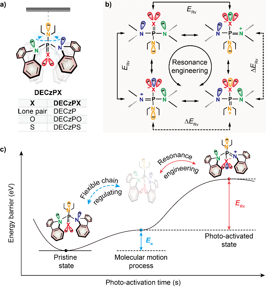 针对这一难题,麻豆传媒 陈润锋教授和黄维院士团队在前期对于动态共振有机光电材料的研究基础之上,发现共振活化能是调控三线态激子产生速率的关键参数,提出利用共振工程构建有机超长室温磷光材料刺激响应能力的调制策略,建立了衡量材料光活化能力的量化参数。利用柔性共振结构与磷光发色团结构,通过光驱动的柔性烷基链实现分子聚集态的调控;进一步的,通过共振工程有效地调节材料体系的共振活化能,从而调控其相应的三线态激子产生速率,开发具有可调制动态光响应行为的有机超长室温磷光材料体系。该类共振诱导的刺激响应性有机长余辉材料体系展现出明显的光活化现象,其发光寿命从~40 ms提高到了720 ms,发光效率由1.54%提高到了5.1%,并且表现出可控的光活化速率,随着共振活化能的增加,其光活化速率逐渐降低,在功率密度为0.5 mW/cm2时,其光活化速率可以由0.48 min -1减小到0.31 min -1。