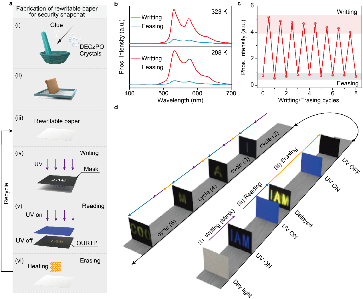 基于这种特殊的刺激响应和高度可逆的有机长余辉发光特性,建立了一种可用于重复书写的“智能”纸。通过利用掩膜版技术,在紫外光的照射下,可以实现图案/信息的按需调制。更为重要的是,由于此类分子的光诱导长余辉发光随着时间的增加逐渐减弱,该“智能”纸记录的图案/信息也会随即消失,从而构建了一类新型的“阅后即焚”加密器件。通过调控光照时间以及保存条件,可以实现信息的按需保存和加密。这项工作通过柔性烷基链和共振工程策略成功实现了刺激响应性有机长余辉材料刺激响应能力的调制,为研制新型智能响应特性的光电功能材料提供了新的技术途径和重要的理论指导。