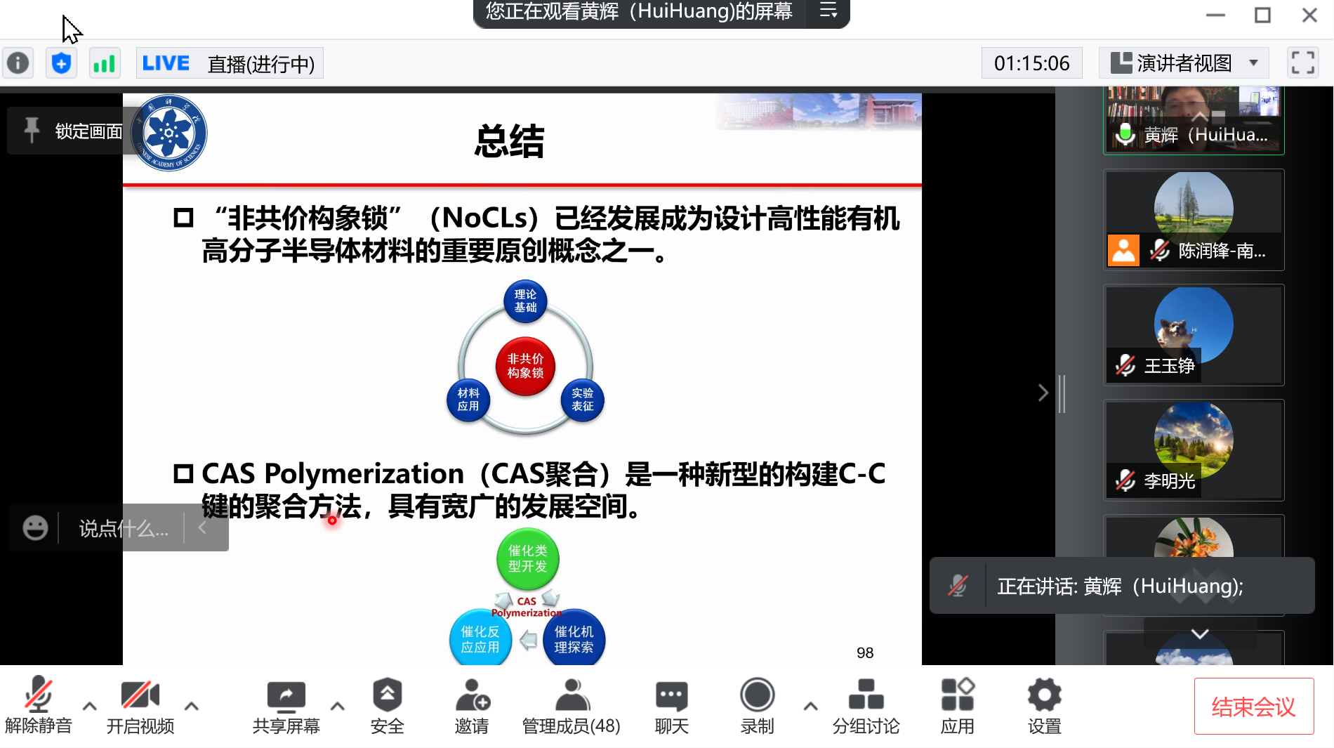 承国脉,薪火相传八十载;创未来,弘毅笃行谱新篇。值此南邮八十华诞校庆学术活动月之际,应麻豆传媒 陈润锋教授邀请,中国科学院大学黄辉教授于2022年4月29日下午2点在腾讯会议和腾讯直播上以“有机高分子半导体材料的设计与合成”为题作了一场精彩报告。材料院副院长陈润锋主持了报告,共有50余名师生参加了线上学习。