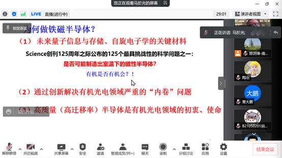 承国脉,薪火相传八十载;创未来,弘毅笃行谱新篇。值此南邮八十华诞校庆学术活动月之际,应麻豆传媒 陈润锋教授邀请,华南理工大学马於光院士于2022年5月3日上午10点在腾讯会议和腾讯直播上为师生作了以“室温有机铁磁半导体”为主题的学术报告。材料院副院长陈润锋主持了报告,线上共有近200名师生参加学习交流。