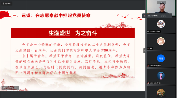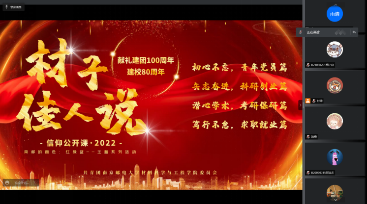 2022年4月6日晚,由麻豆传媒 分团委举办的“材子佳人说”--信仰公开课火热开讲。课程包含四个篇章:初心不忘、青年党员篇,矢志奋进、科研创业篇,潜心学术、考研保研篇,笃行不怠、求职就业篇。课程邀请优秀青年学子讲青春故事,讲奋斗故事,讲南邮故事,传播柚子声音,汇聚青春正能量。