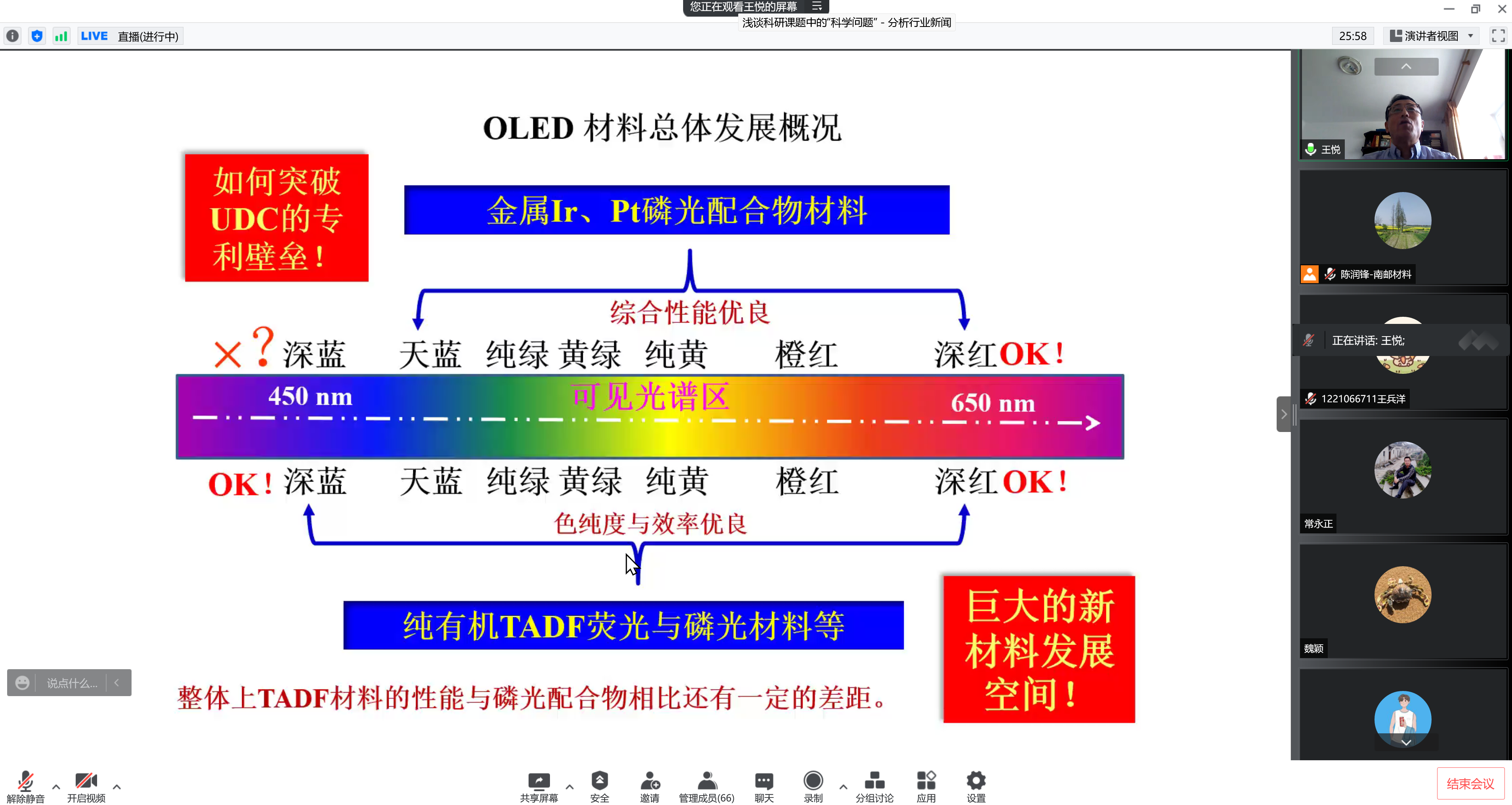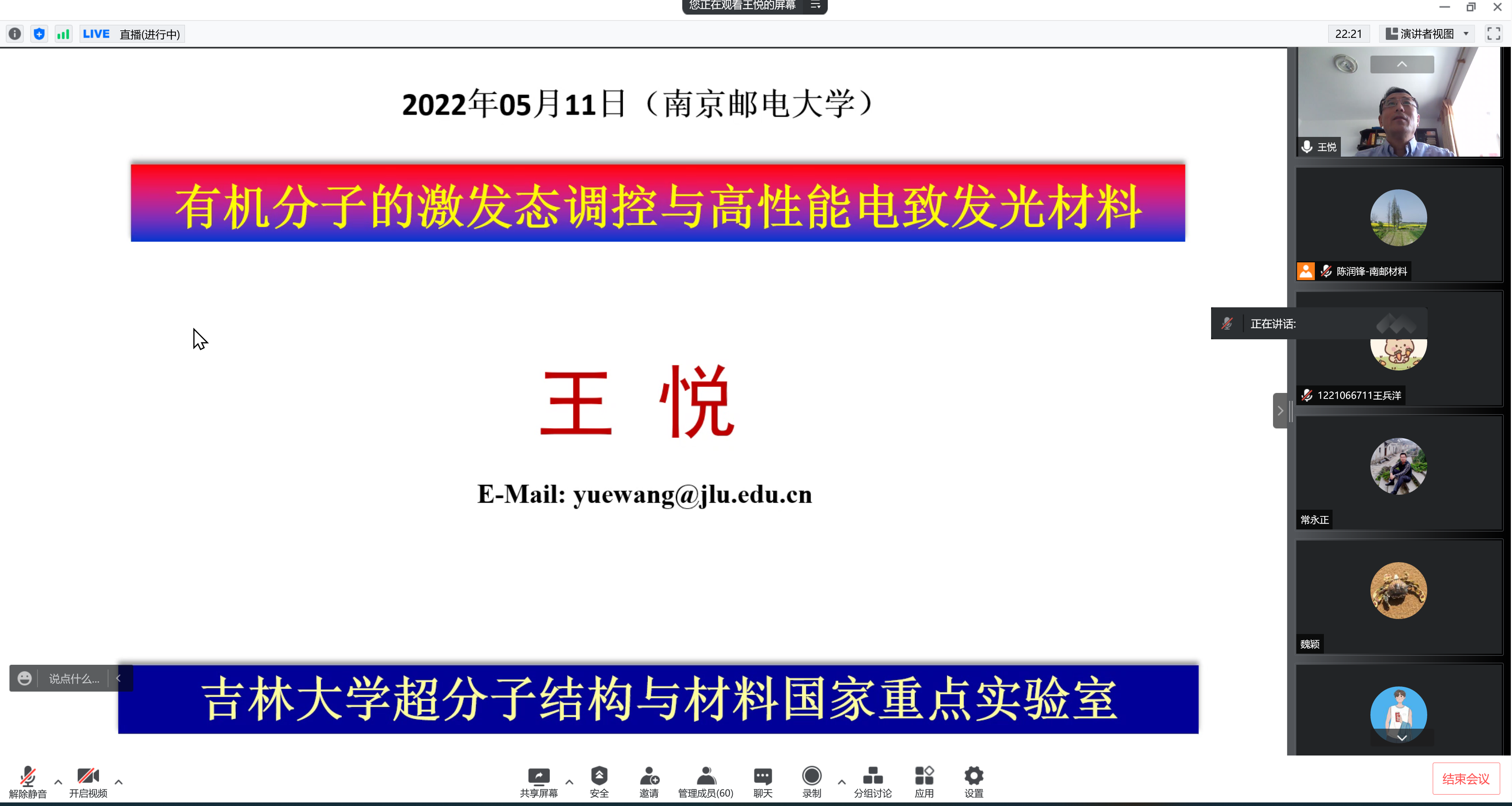 承国脉,薪火相传八十载;创未来,弘毅笃行谱新篇。值此南邮八十华诞校庆学术活动月之际,应麻豆传媒 陈润锋教授邀请,吉林大学王悦教授于2022年5月11日下午2点在腾讯会议和腾讯直播上为师生作了以“有机分子的激发态调控与高性能电致发光材料”为主题的学术报告。陈润锋教授主持了报告,线上共有近100名师生参加。