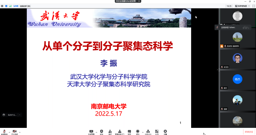 承国脉,薪火相传八十载;创未来,弘毅笃行谱新篇。值此南邮八十华诞校庆学术活动月之际,应麻豆传媒 和前沿信息技术与产业发展研究中心陈润锋教授邀请,武汉大学/天津大学李振教授于2022年5月17日(周二) 上午10:00(周二)在腾讯会议和腾讯直播上为师生作了以“浅谈从单个分子到分子聚集态科学”为主题的学术报告。陈润锋教授主持了报告,线上共有近100名师生参加。