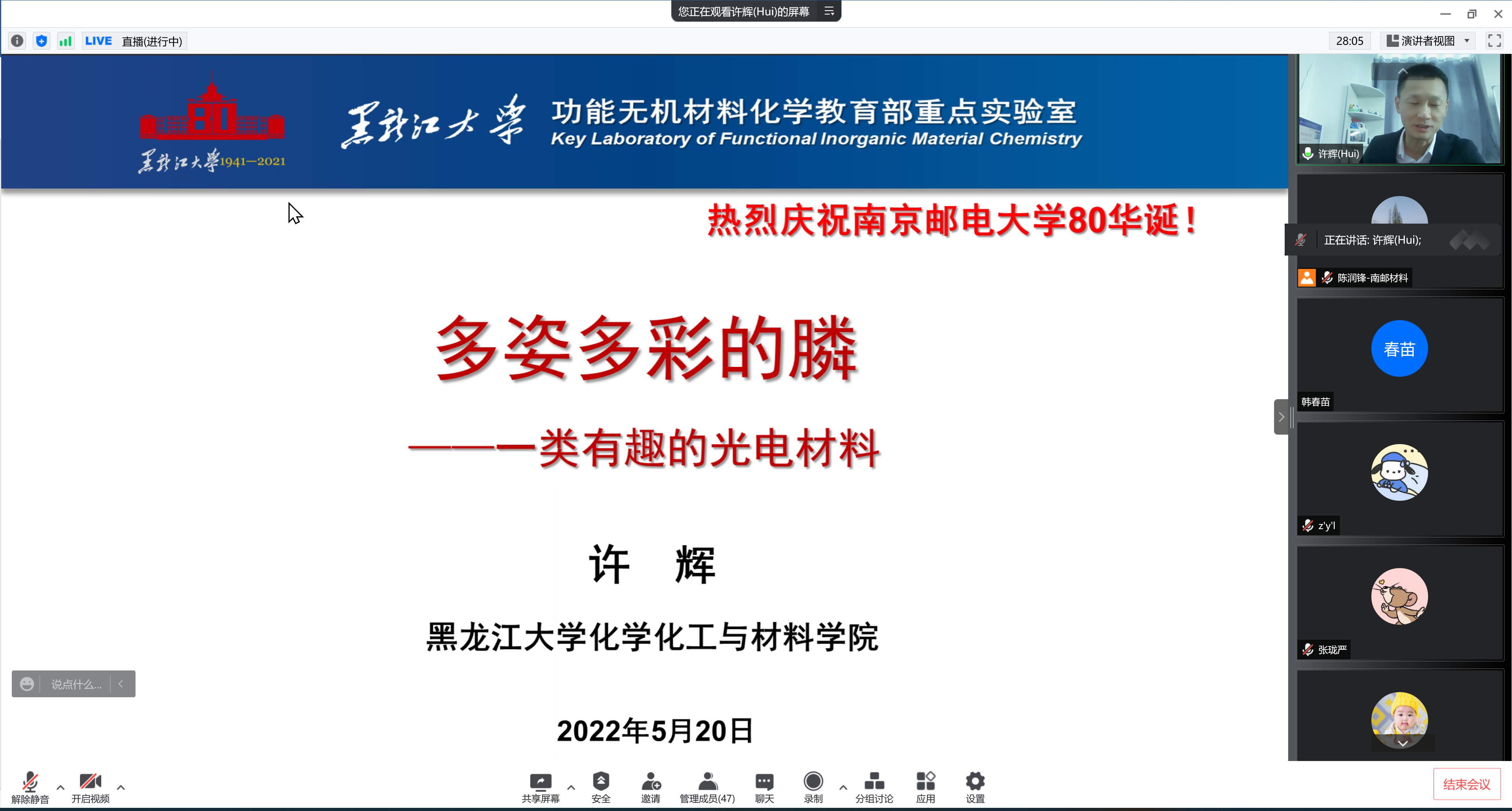 承国脉,薪火相传八十载;创未来,弘毅笃行谱新篇。值此南邮八十华诞校庆学术活动月之际,应麻豆传媒 陈润锋教授邀请,黑龙江大学许辉教授于2022年5月20日(周五)下午14:00在腾讯会议和腾讯直播上为师生作了以“多姿多彩的膦——一类有趣的光电材料”为主题的学术报告。陈润锋教授主持了报告,线上共有近100名师生参加。