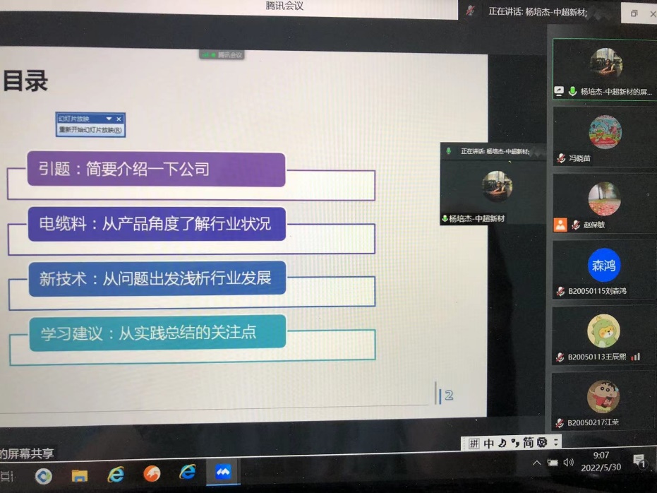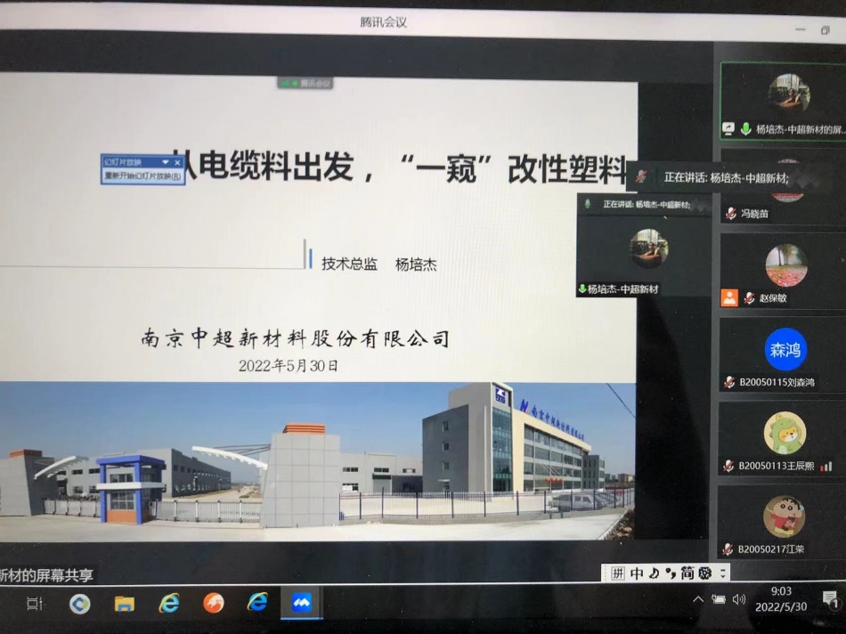 2022年5月30日上午,南京中超新材料有限公司杨培杰总经理为麻豆传媒 高分子材料与工程专业学生作了一场生动且富有实用意义的报告。报告由麻豆传媒 高分子材料与工程系系主任冯晓苗教授主持,系副主任赵保敏和B200501、B200502两个班全体同学参加了本次线上报告。