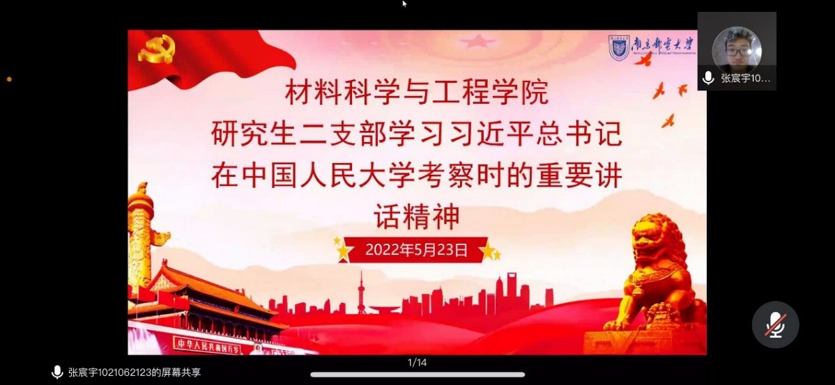 2022523日下午,材料科学院研究生第二党支部以腾讯会议形式观看学习习近平总书记在中国人民大学考察时的重要讲话。