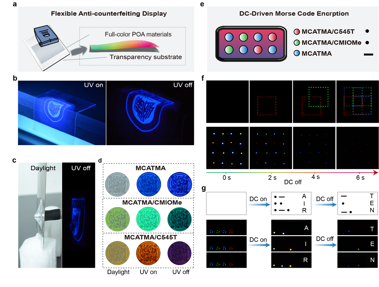 纯有机长余辉材料因其发光寿命大于100 ms、在黑暗条件下撤去激发光源后仍可持续发光的奇特现象在高级加密防伪显示等领域受到广泛关注。但是由于三线态激子固有的内在性质,很难实现效率和寿命的同时提升,并且对外界环境如氧、温度、力、溶剂敏感,使得有机长余辉材料在复杂环境中同时具有高发光效率、长发光寿命、高稳定性成为巨大的挑战。针对这一问题,陈润锋教授带领的团队提出用2D超晶格嵌入发色团策略,利用三组分、三重氢键相连的超分子网络,实现了磷光效率(PhQY)高达65%、磷光寿命(τPh)为1.3 s的深蓝有机长余辉,并且首次提出品质因子FM(Figure-of-Merit,FM= PhQY×τPh)来衡量评估有机长余辉性能。进一步,利用短波的深蓝余辉发射构建有效的共振能量转移过程,将长余辉颜色从蓝色调至绿色以及紫红色,成功获得了全彩有机长余辉材料,同样地该类材料在力压、剧烈研磨、高温达473 K、各种溶剂浸泡等复杂环境中都表现出优异的长余辉发射。基于这些优异的性质,构建了多彩柔性防伪及直流驱动莫斯加密应用,极大推动了高性能有机长余辉材料的开发以及多功能型的应用的构筑。