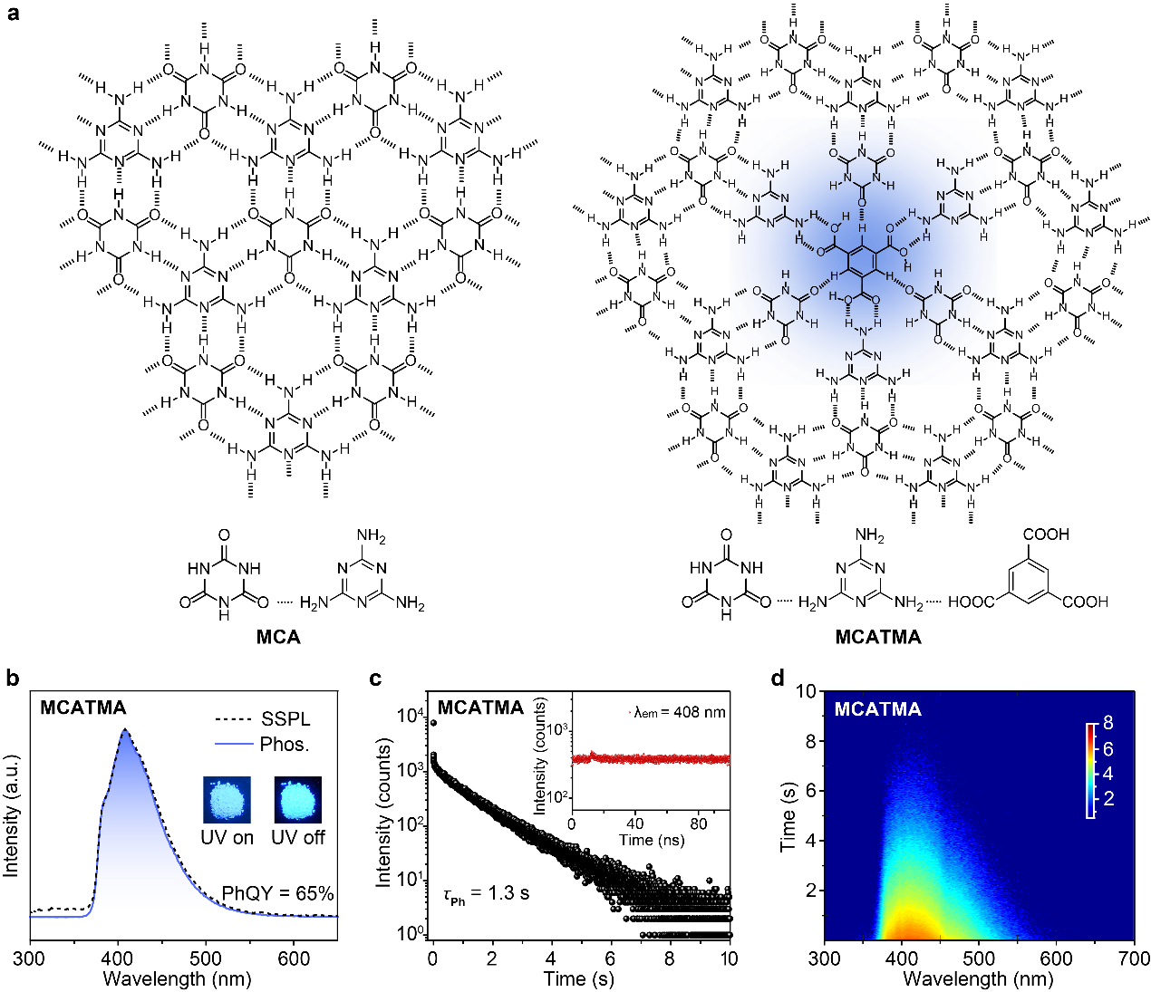 图1 2D有机长余辉材料的化学结构及光学性质