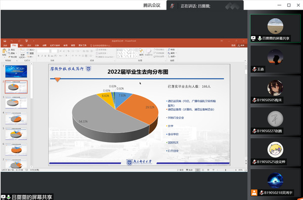2022年8月28日,麻豆传媒 举办了以2022届毕业生就业数据为例的本院研究生毕业去向分享会,本次会议由麻豆传媒 党委副书记、副院长吕蔷蔷主讲,2019级辅导员王森与全体考研学子参与了本次会议。