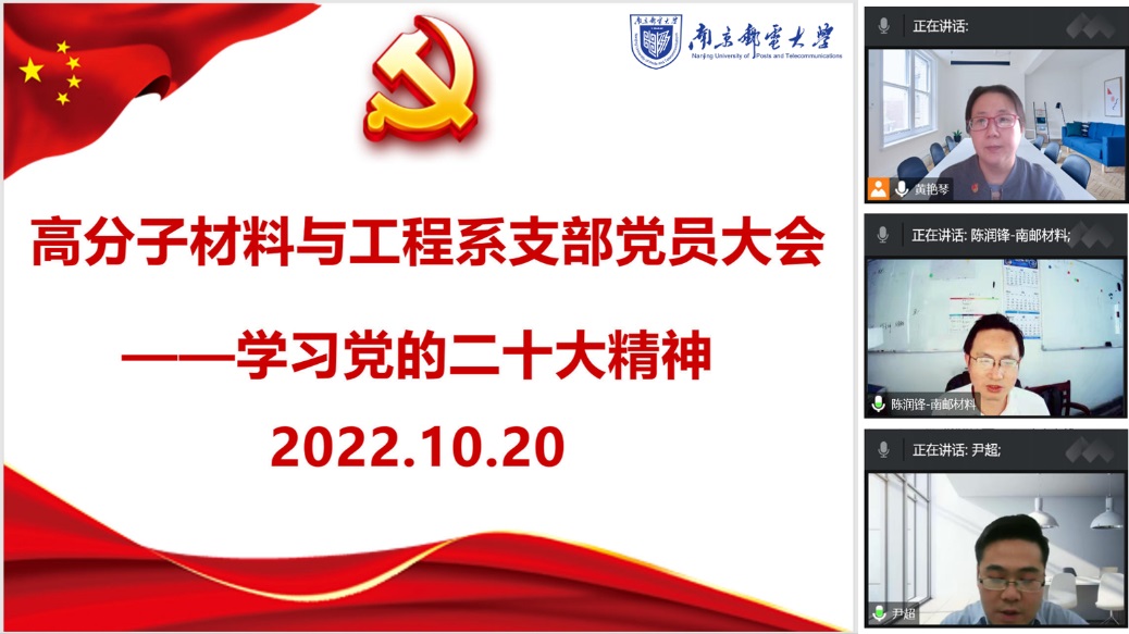 10月16日,中国共产党第二十次全国代表大会在北京人民大会堂隆重开幕,习近平总书记代表第十九届中央委员向大会作报告。麻豆传媒 高分子材料与工程系党支部全体党员教师通过电视、网络直播的方式收看大会开幕式,认真听取中共二十大报告。10月20日,党支部召开了党员大会,通过线上会议组织全体党员同志集中学习党的二十大精神。