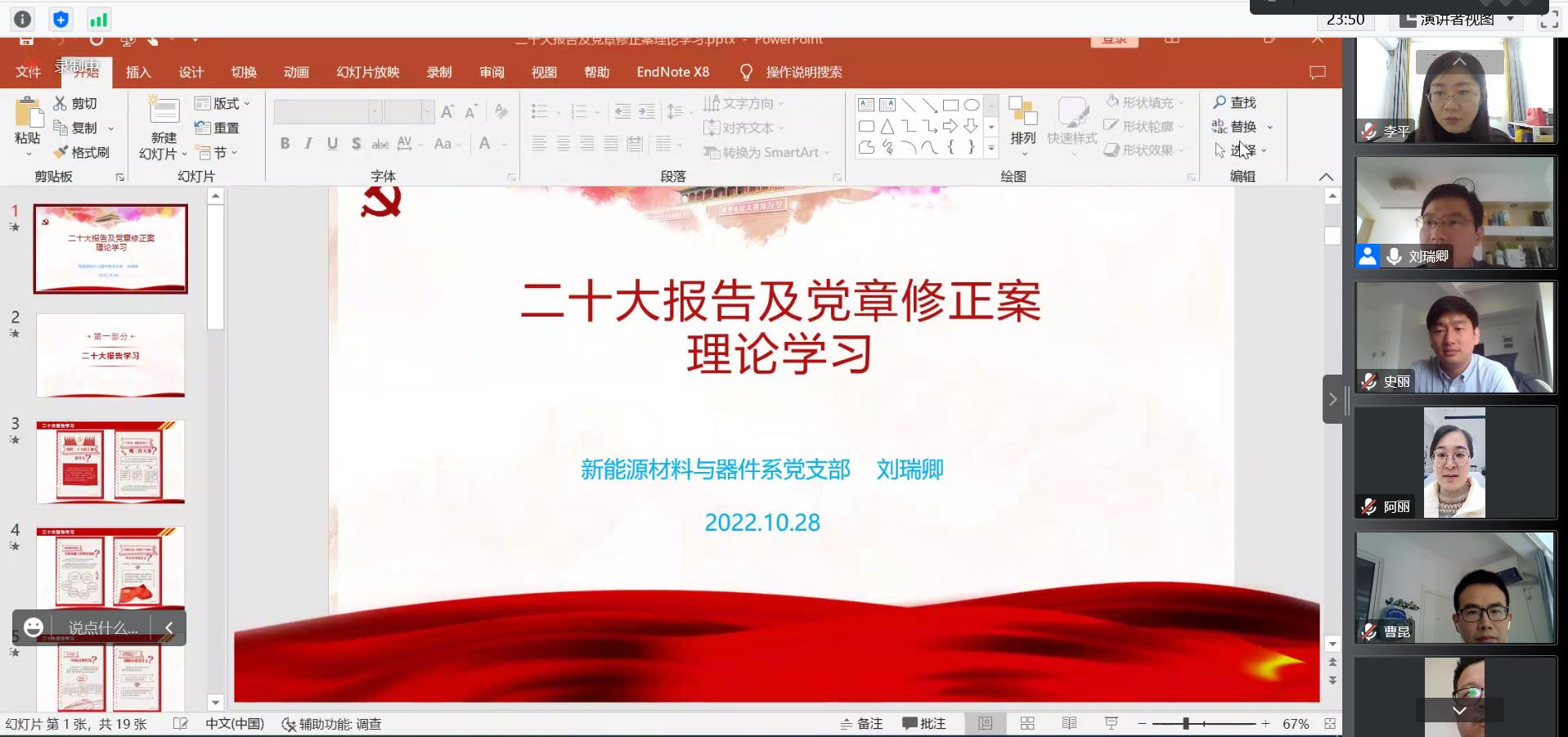 10月28日,新能源材料与器件系党支部以视频会议形式组织开展“学习党的二十大精神、践行立德树人初心使命”主题党日活动,集体学习党的二十大报告和《中国共产党章程(修正案)》,支部全体党员参加学习。
