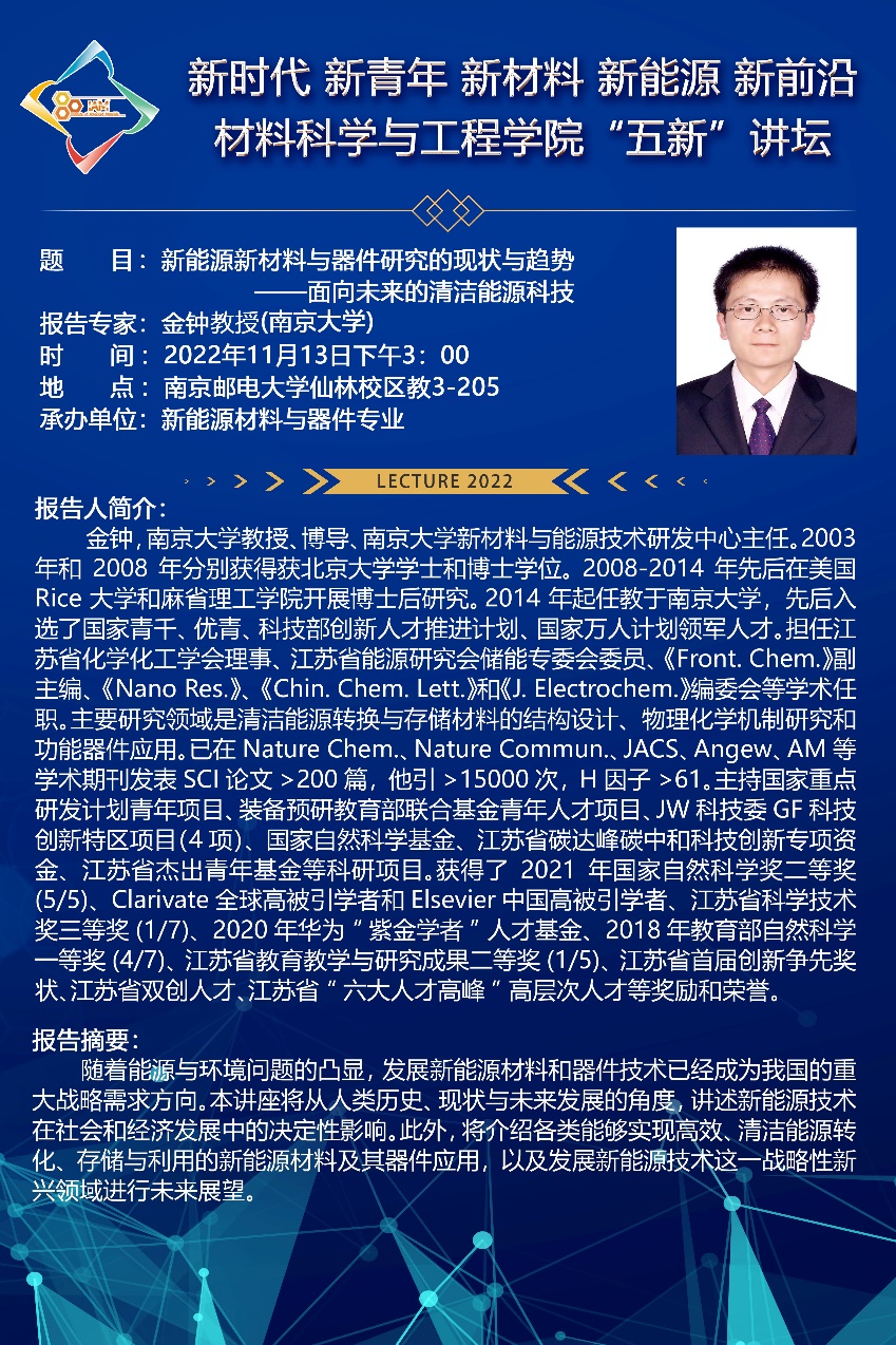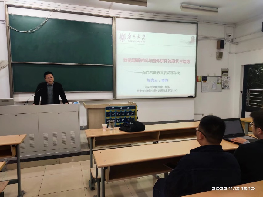 2022年11月13日下午,麻豆传媒 在教3-205教室成功举办了第三期主旨为“新时代、新青年、新材料、新能源、新前沿”的“五新”讲坛。此次讲坛的主讲嘉宾为南京大学新材料与能源技术研究中心主任、国家领军人才、国家优秀青年基金获得者金钟教授。新能源材料与器件专业的全体学生和部分专业骨干老师及研究生参加了本次讲坛,本次讲坛由新能源材料与器件系主任黄镇东教授主持。