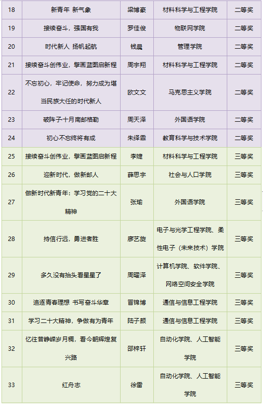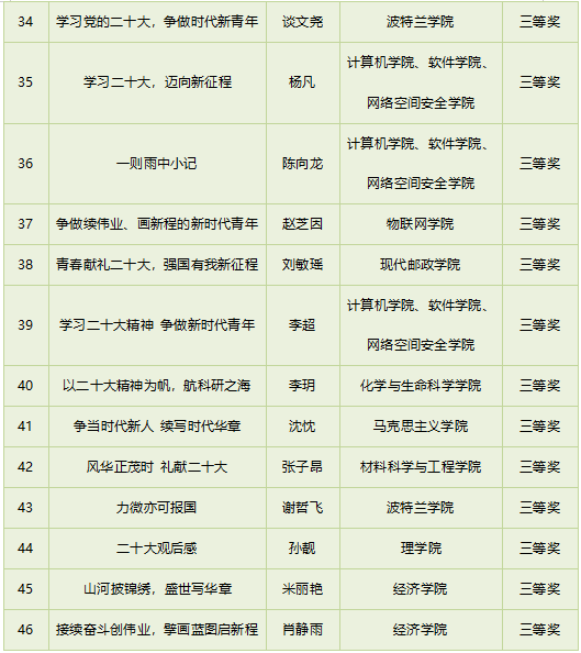 经过组织专家初评,终评,一大批优秀作品脱颖而出。其中麻豆传媒 研究生丁传安同学的《时代新人·说》,李晓妞同学的《聆听时代之声,传承时代使命》,周宇翔同学的《接续奋斗创伟业,擘画蓝图启新程》等作品喜获二等奖。张子昂同学的《风华正茂时,礼献二十大》等作品喜获三等奖。本次征文比赛共评选出10个一等奖,14个二等奖,22个三等奖。