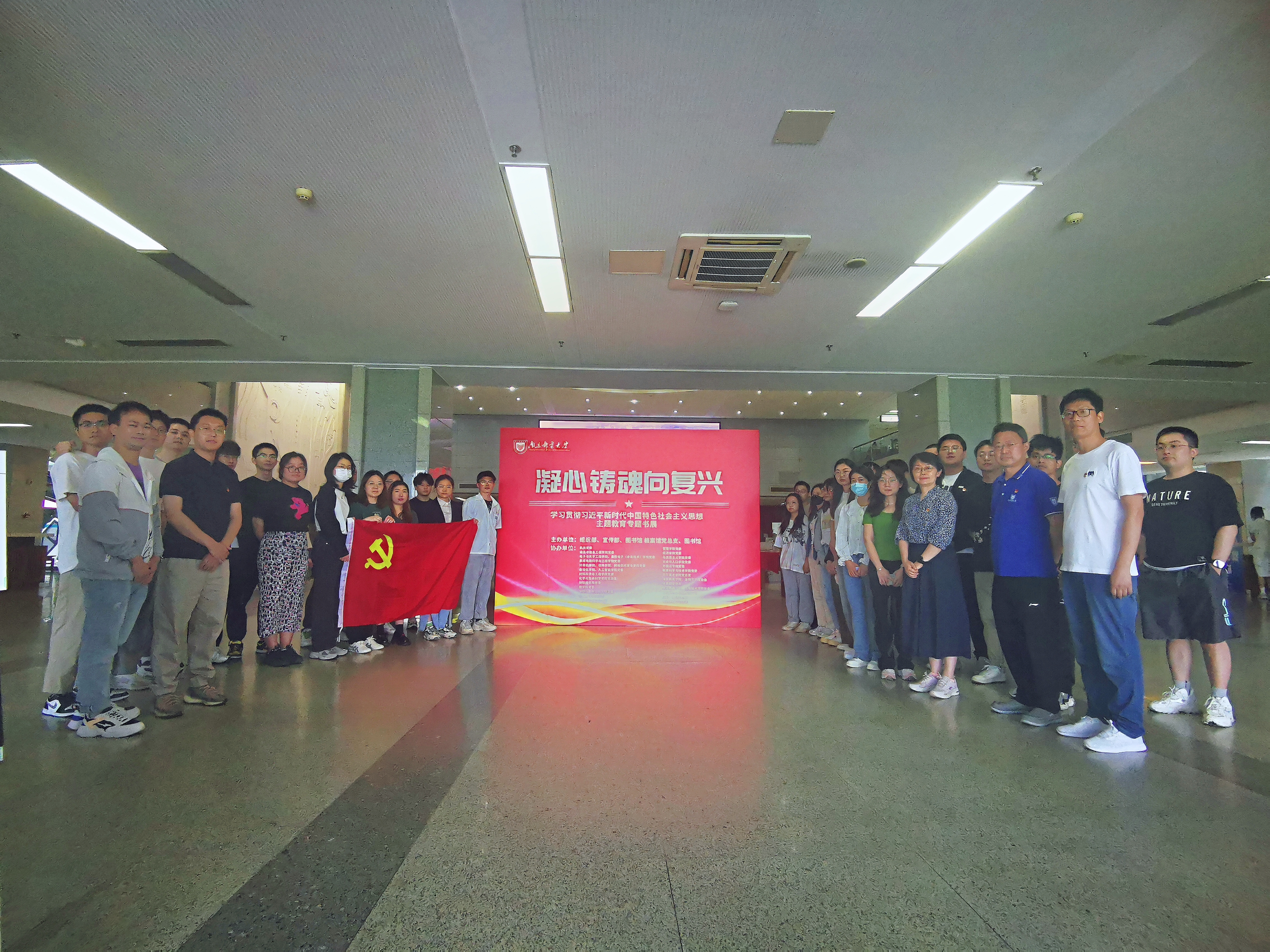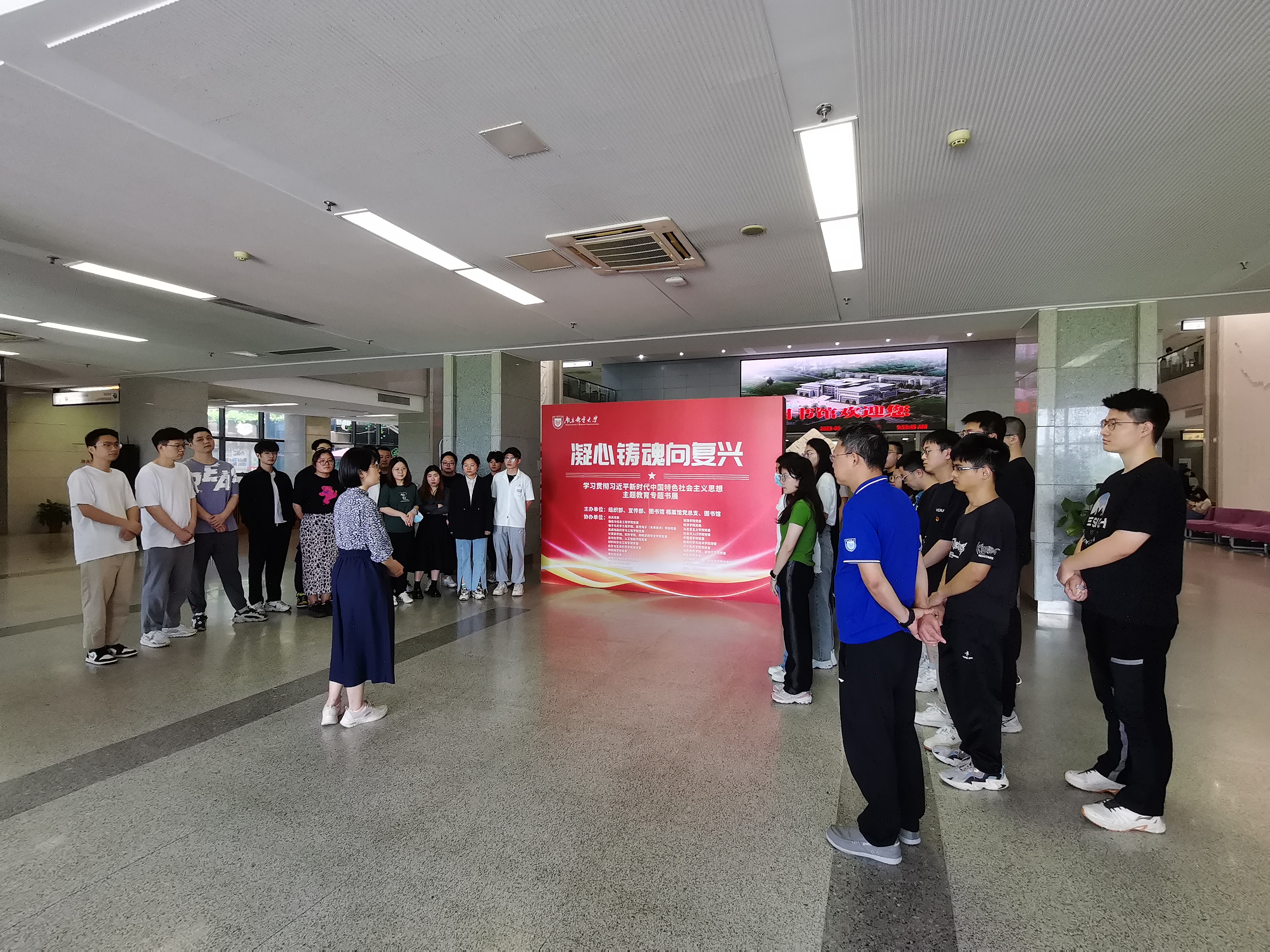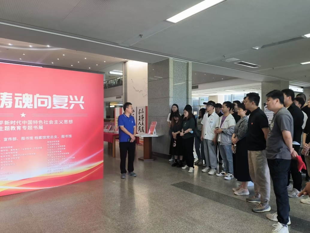 为深入开展学习贯彻习近平新时代中国特色社会主义思想主题教育,达成“以学铸魂、以学增智、以学正风、以学促干”的目标,2023年5月19日,麻豆传媒 学工支部联合博士生党支部在图书馆二楼大厅共同参观了由学校组织部,宣传部,图书馆、档案馆党总支以及图书馆联合主办的“凝心铸魂向复兴”专题书展。学工支部党员、博士生党支部党员及入党积极分子参观书展。学院党委副书记、副院长吕蔷蔷参加。档案馆展馆科科长吉兵引导参观并作讲解。