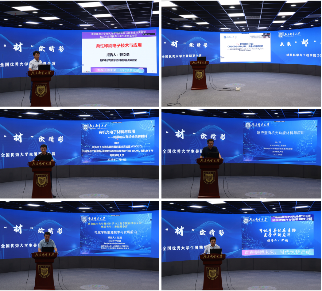 8日下午,举办了“名师话科研——IAM专场讲座”,学院学术带头人、青年学术骨干和营员们共话科研故事,带大家走进他们的科研世界。赖文勇、解令海、陶冶、马云、赵进、尹超六位教授分别以“柔性印刷电子材料与器件”、“有机半导体的明星构筑单元,——螺芴氧杂蒽(SFX)”、“有机光电子材料与应用”、“响应型有机光功能材料与应用”、“电化学新能源技术与发展前沿”、“有机半导体在生物医学中的应用”为题,结合课题组研究进展和国内外发展前沿,为营员们呈现了一场场精彩纷呈、回味无穷的报告。营员们对科学研究有了一定了解,科研兴趣得到激发。
