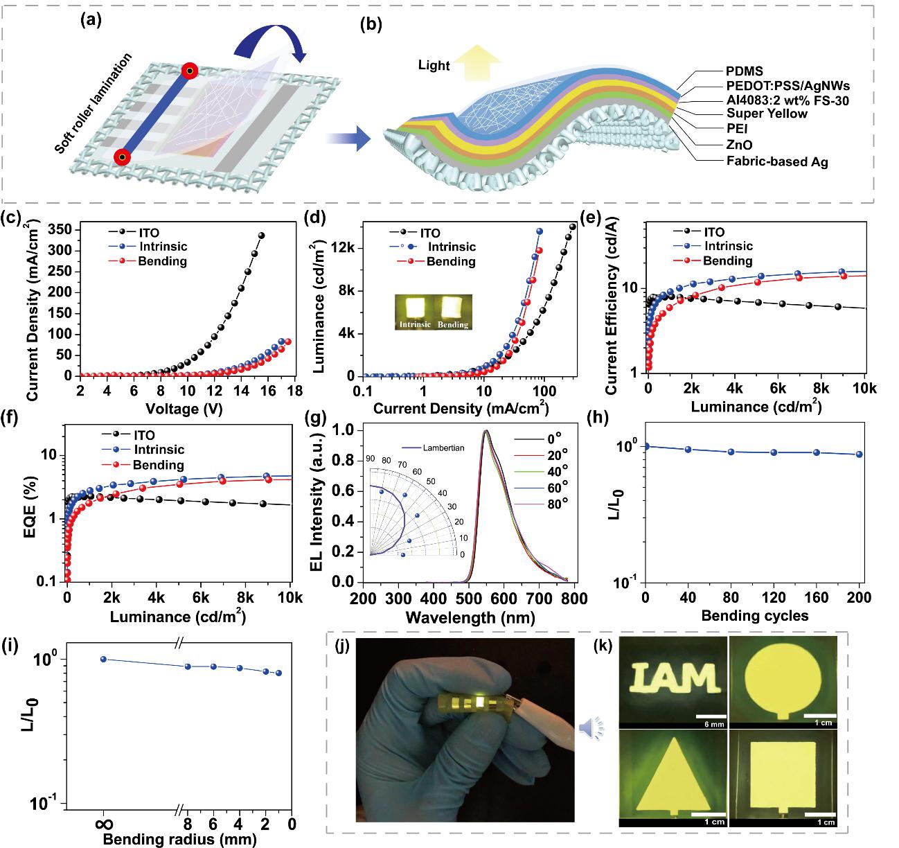 针对这一难题,麻豆传媒 麻豆传媒 、有机电子与信息显示国家重点实验室张新稳教授与陈月花副教授课题组提出了柔性大面积RBE和TTE的全溶液印刷制备方案,研制出织物衬底的可穿戴顶发射聚合物发光器件(Fa-TPLED)。通过快速银镜反应并结合剥离技术在织物衬底上制备出高反射率银阴极(~94%)和高透光率的PDMS/AgNWs/PEDOT:PSS透明阳极(~84%),系统研究了TTE与衬底界面之间的分离机制。通过软接触层压制备出大面积Fa-TPLED,器件的电流效率为16.3 cd/A,外量子效率为4.9%,并且完全抑制了由微腔效应引起的发射光谱角度依赖性和非朗伯发射。此外,Fa-PLED具有优异的机械稳定性,在连续弯折200次(弯折半径为4 mm)后器件的电流效率仍能保持到14.3 cd/A。该研究成果为低成本、高效率的织物可穿戴器件的发展提供了一条新途径,在新兴的智能柔性/可穿戴电子产品中显示出巨大的应用潜力。相关结果以“Efficient Flexible Fabric-Based Top-Emitting Polymer Light-Emitting Devices for Wearable Electronics”为题发表在《Small》期刊上。重点实验室张新稳教授和陈月花副教授为共同通讯作者,李瑞卿博士为论文第一作者。
