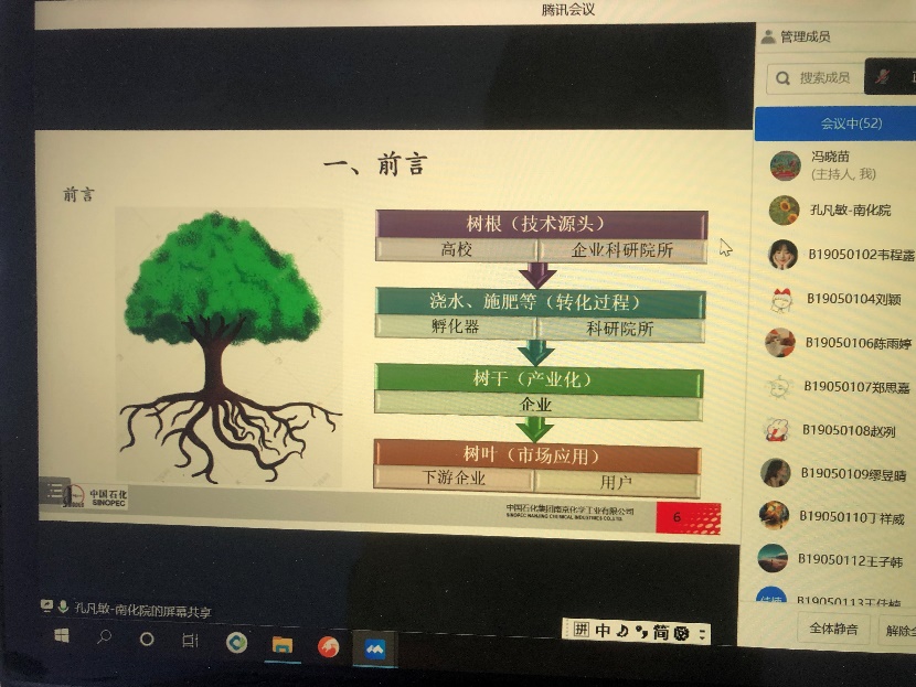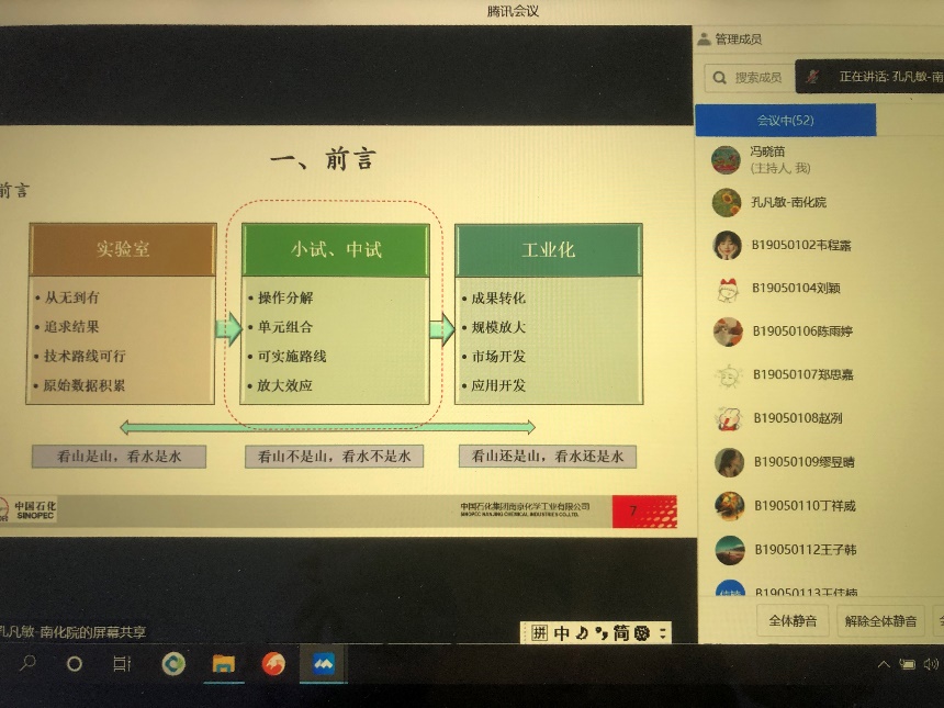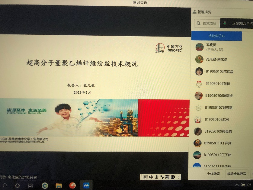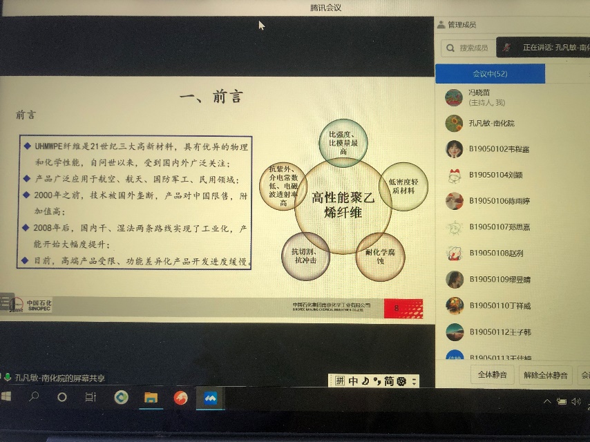 2023年2月15日上午,南化研究院气体净化所孔凡敏工程师为麻豆传媒 高分子材料与工程专业大四学生进行远程培训。本次培训由麻豆传媒 高分子材料与工程系系主任冯晓苗教授主持,系副主任周馨慧教授和B190501、B190502两个班全体同学参加了本次远程培训。
