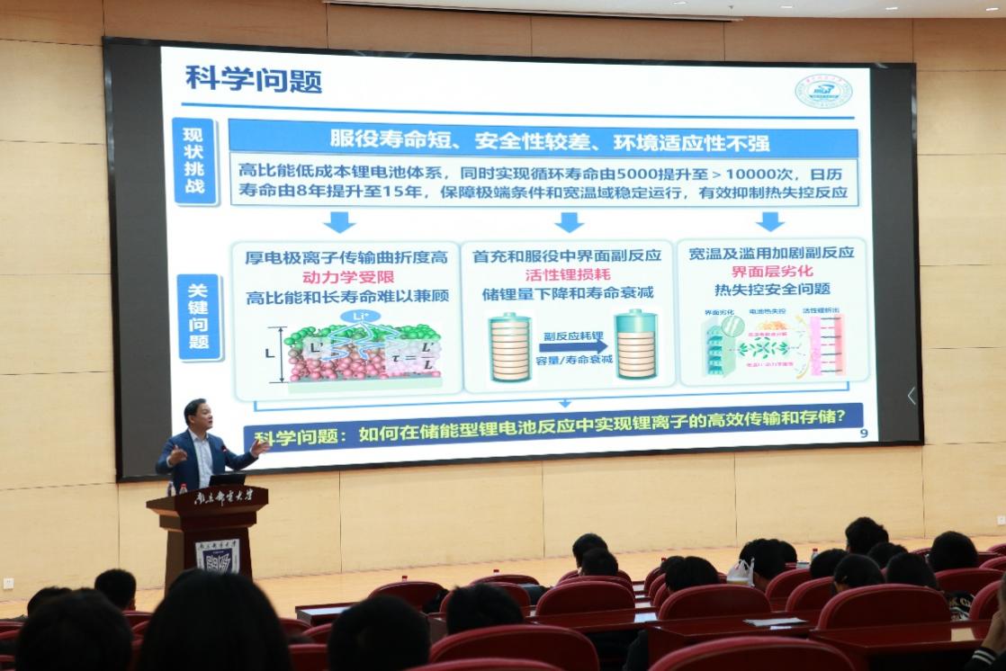 谢佳教授先从自身的求学经历、科研方向的探索、和从企业到高校角色转换等心路历程的分享开始,向同学们深入浅出地讲述了选择将自己的研究方向确定为“规模化锂离子电池储能关键技术”的缘由和初衷,及在国家“双碳”战略驱动下,锂离子电池等大规模储能技术的发展现状和趋势,并分享了其课题组近年来在廉价规模化储能技术领域获得的创新成果和宝贵经验。最后,谢佳教授还寄语本专业同学,要强健体魄、打牢基础、积极创新,并热情邀请本专业同学将来赴华中科技大学深造。老师和同学们在认真听取了谢佳教授的精彩讲座,反响强烈,并与谢佳教授进行了深入探讨。谢佳教授详细解答了学生提出相关问题,并围绕新能源材料与器件专业发展和人才培养等话题与在场师生开展了热烈讨论。