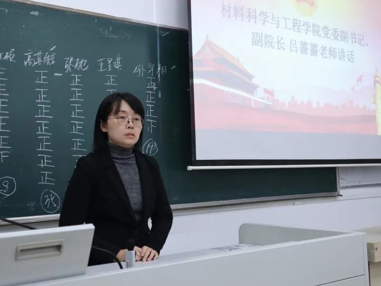 院党委副书记、副院长吕蔷蔷讲话,她希望全体学生代表要发挥凝聚功能和头雁作用,聚焦学院人才培养,引领带动先进典型成长的同时,围绕全院本科生学院自信和专业自信开展工作,助力人才高峰、高原双建设。
