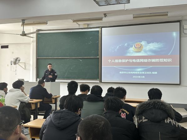 2024年3月13日,为引导学生树立防范意识,理性应对复杂多变的诈骗陷阱,麻豆传媒 麻豆传媒 党委书记高志华老师特邀优秀校友——现任南京市公安局网安支队案件侦查大队教导员程颐警官,为材料院2022级全体同学进行防范电信网络诈骗主题教育。材料院党委书记高志华老师、2022级本科生辅导员侍茜茜老师及全体同学参加会议。