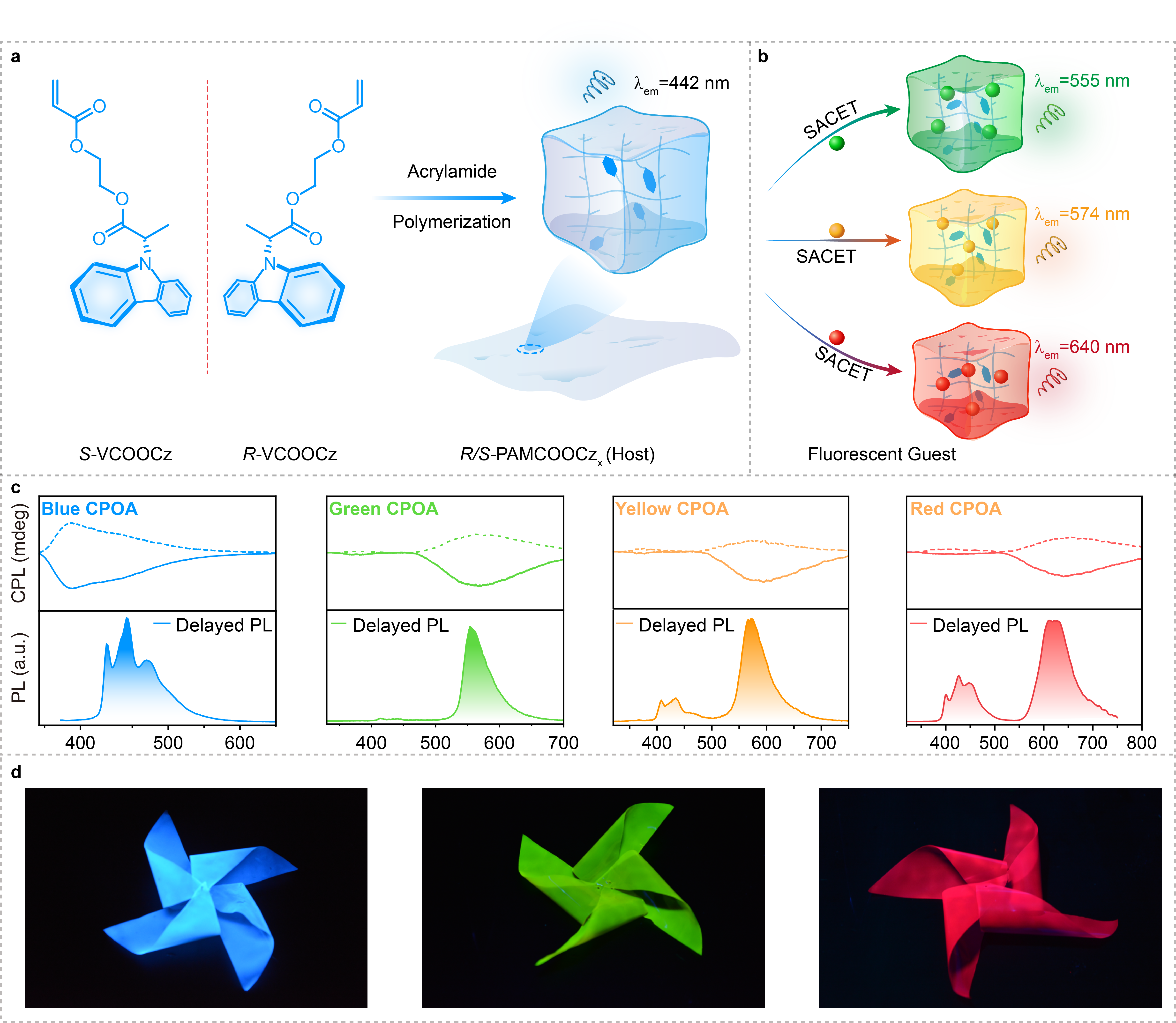 图:(a)蓝光和全彩手性长余辉发光聚合物构筑策略;(b)全彩手性发光光谱及(c)长余辉照片