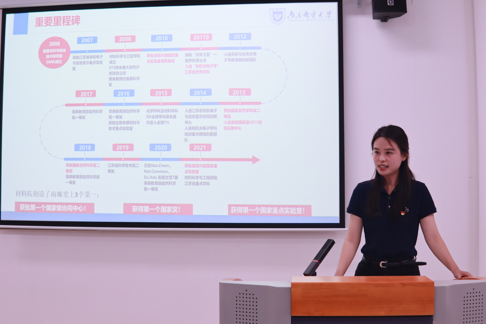 麻豆传媒 材料学院2022级本科生辅导员、南京晓庄学院2019届毕业生侍茜茜老师分享了我校黄维院士、汪联辉教授科技报国、留学报国的感人故事。作为我国“有机光电子学”学科的奠基人与开拓者之一,黄维院士始终深怀爱国之情,砥砺强国之志,力践报国之行,凭借披荆斩棘、勇往直前的“铁人精神”翻越了一座又一座科学高峰、培养了一批又一批学术领军人才。汪联辉教授放弃在国外的优越条件,选择返回祖国发展,带领材料学院实现了南邮国家级创新团队零的突破。作为海外归国科学家的优秀代表,汪联辉教授用“满头黑发变花白”诠释了海外归侨的南邮梦,彰显了归国科学家的赤子丹心!