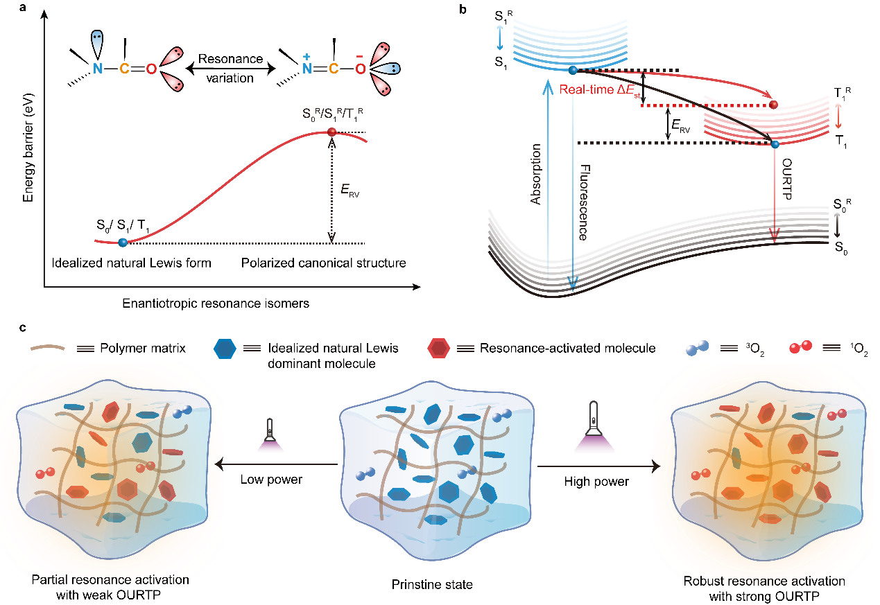 1:(a)共振互变及共振能示意图;(b)共振互变减小实时单线态—三线态能量差(c)共振活化程度不同致使OURTP强弱差异