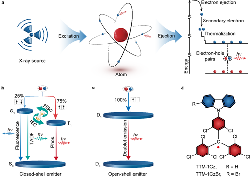 有机X射线闪烁体(OXSTs)材料具有结构易修饰、成本低、毒性小等优点,在X射线成像、辐射检测和光动力治疗等领域有广泛的应用前景,近年来一直是材料化学界的研究热点。但现存的OXSTs材料都为闭壳分子,其在X射线辐射下会产生75%的三线态激子,导致激子利用率低和发光寿命长等问题。因此,如何设计制备兼具高激子利用率和短辐射发光寿命的OXSTs材料仍然是该领域的一个重大挑战。
