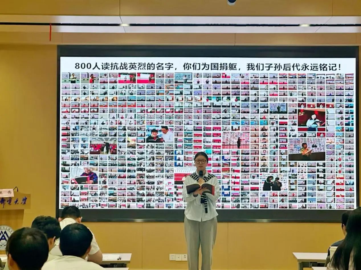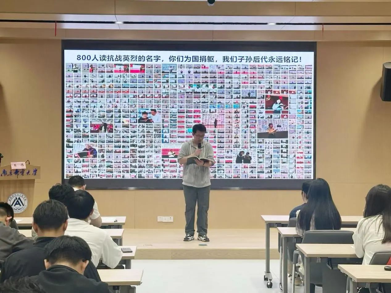 讲座过程中,王伟老师邀请两名同学朗读《抗战阵亡将士名录》中同姓氏篇章的部分内容,以此告慰英烈、铭记历史,通过沉浸式的教育方式呼吁新时代青年要勇于担当,建功立业,请抗战忠魂检阅腾飞青春!