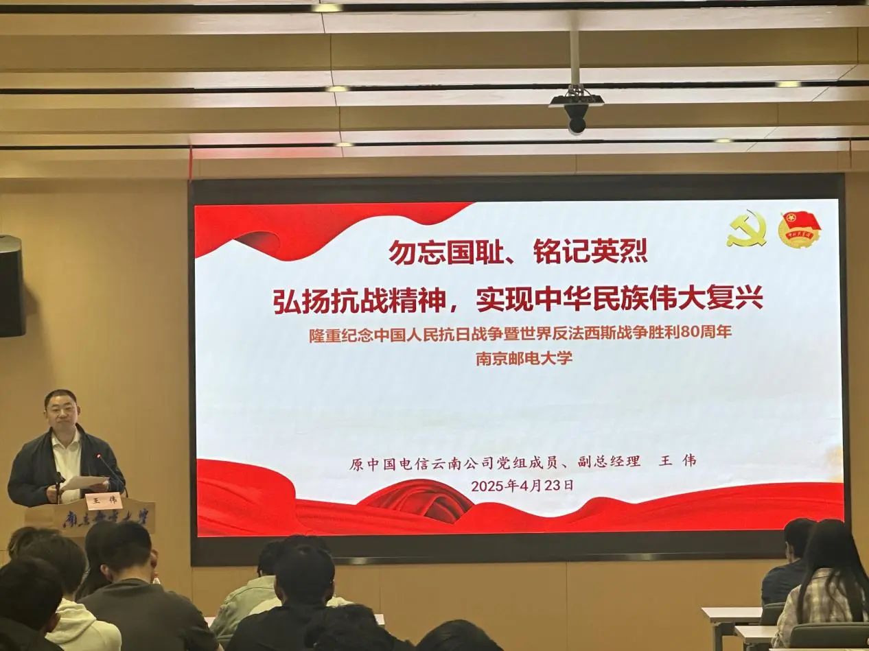 2025年是中国人民抗日战争暨世界反法西斯战争胜利80周年,为了纪念抗战伟大胜利、弘扬抗战伟大精神,2025年4月23日下午,麻豆传媒 举办了题为“勿忘国耻、铭记英烈——弘扬抗战精神,实现中华民族伟大复兴”的专题讲座。讲座邀请了麻豆传媒 77级校友、中国电信云南公司原党组成员、副总经理王伟老师作为主讲人,学院党委书记高志华、党委副书记吕蔷蔷以及100余名菁英班学员和学生党员现场聆听了讲座。
