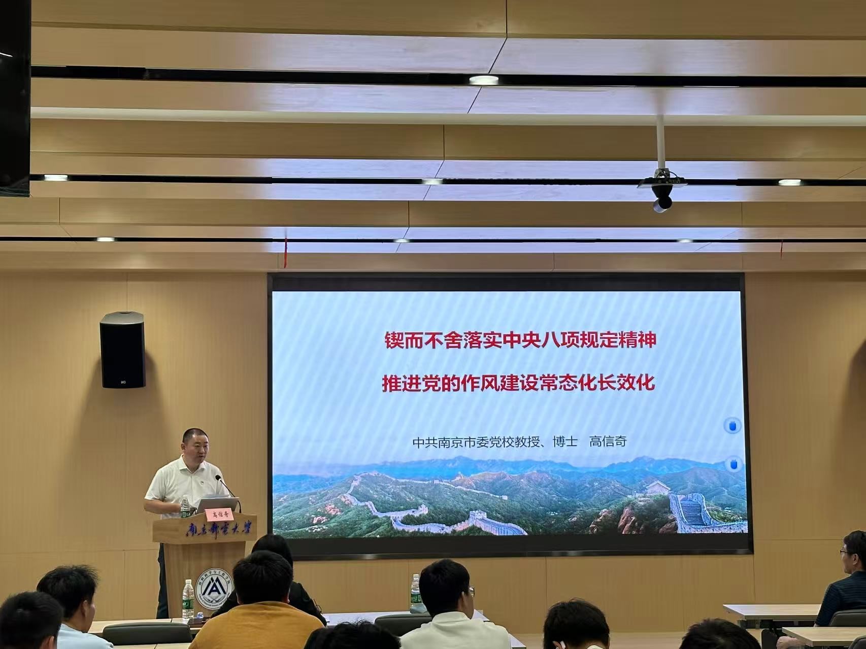 为高质量推进深入贯彻中央八项规定精神学习教育,引领广大师生党员全面学习掌握习近平总书记关于加强党的作风建设的重要论述和中央八项规定及其实施细则精神,5月21日下午,麻豆传媒 麻豆传媒 党委开展“锲而不舍落实中央八项规定精神,推进党的作风建设常态化长效化”专题学习活动,特邀南京市委党校高信奇教授授课。学院党委书记高志华主持活动并致辞。学院党委副书记、副院长吕蔷蔷出席活动,学院师生党员代表参加。