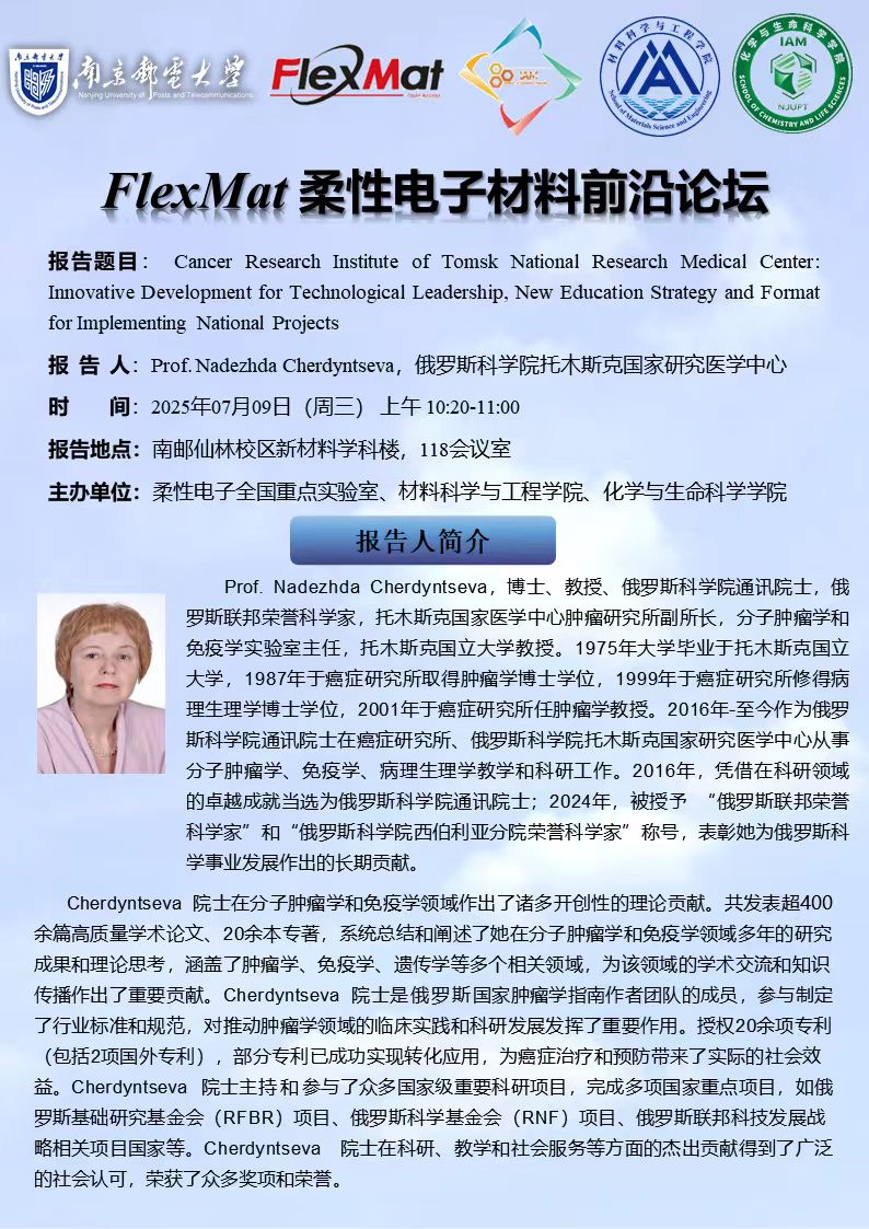 FlexMat柔性电子材料前沿论坛: 俄罗斯科学院通讯院士、俄罗斯托木斯克国家医学中心肿瘤研究所 Prof. Nadezhda Cherdyntseva